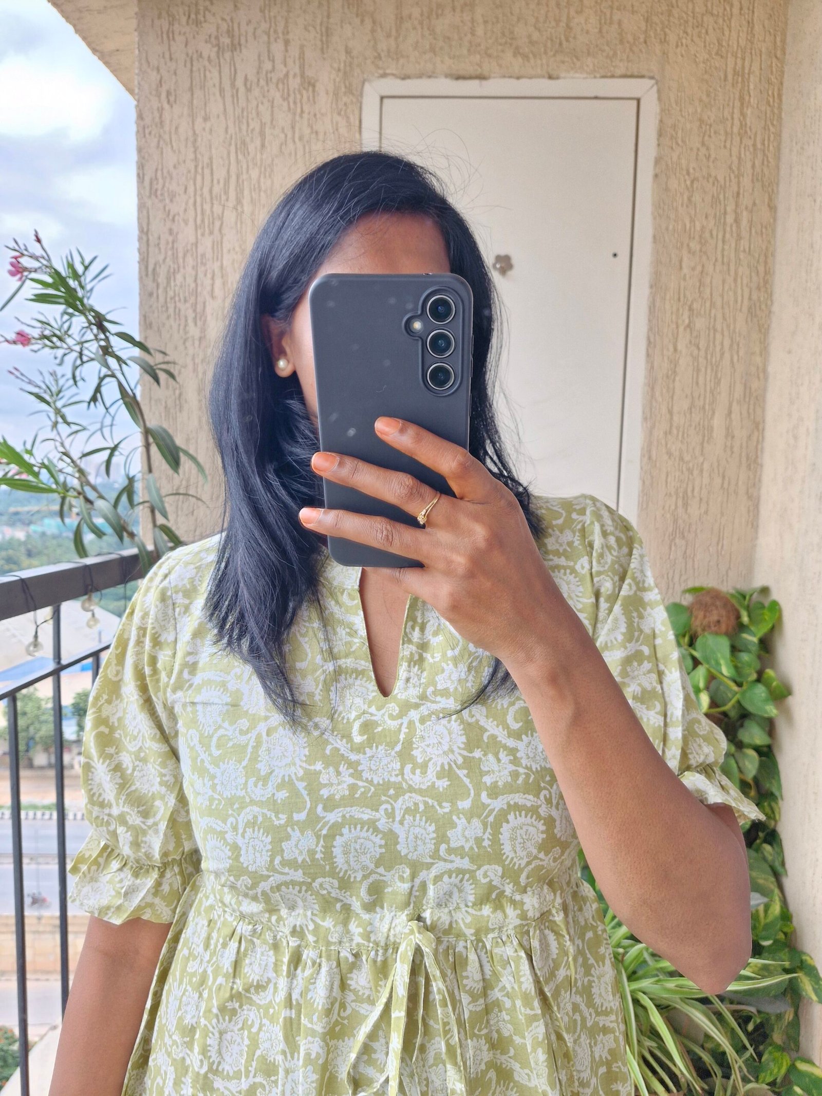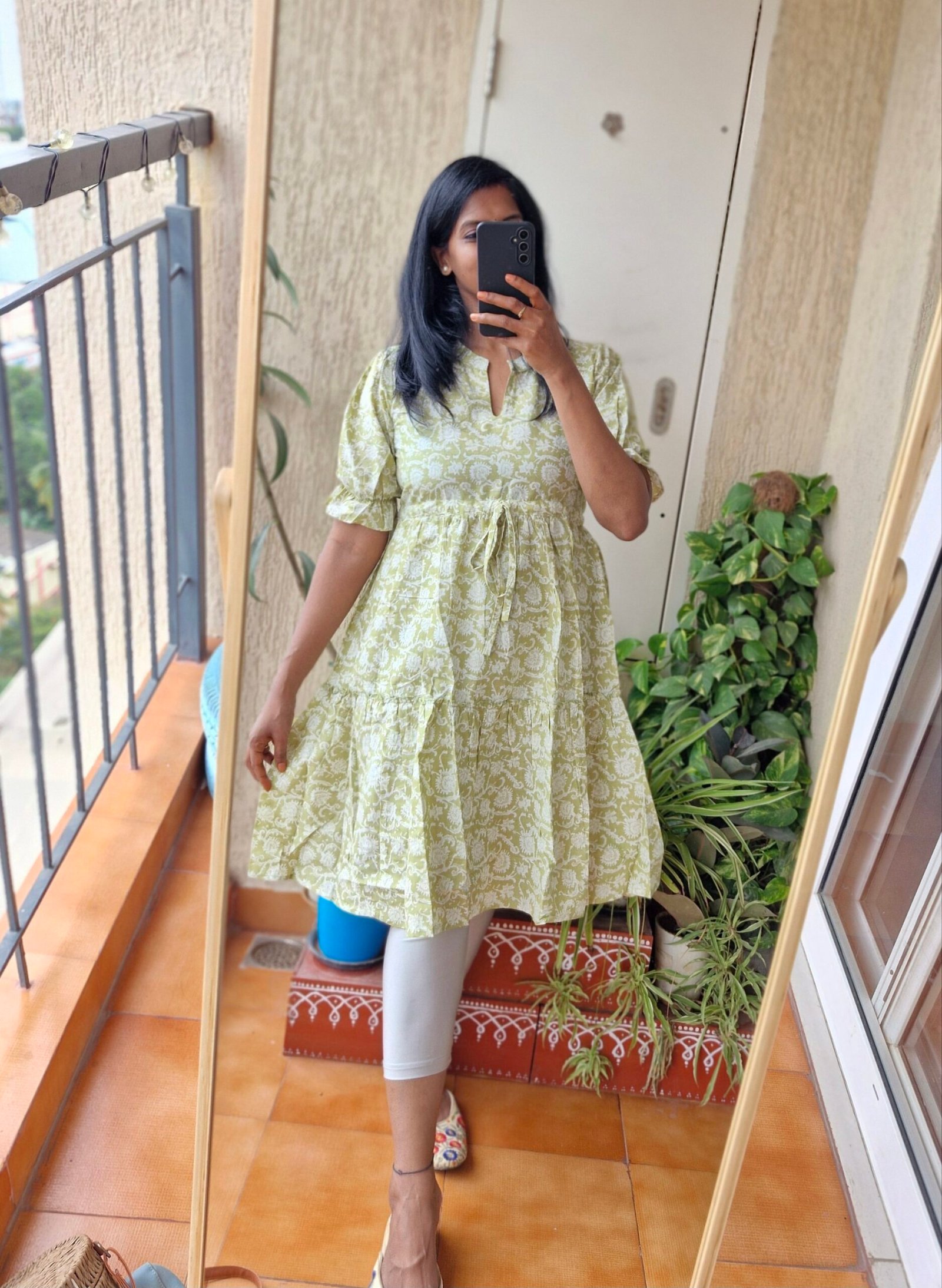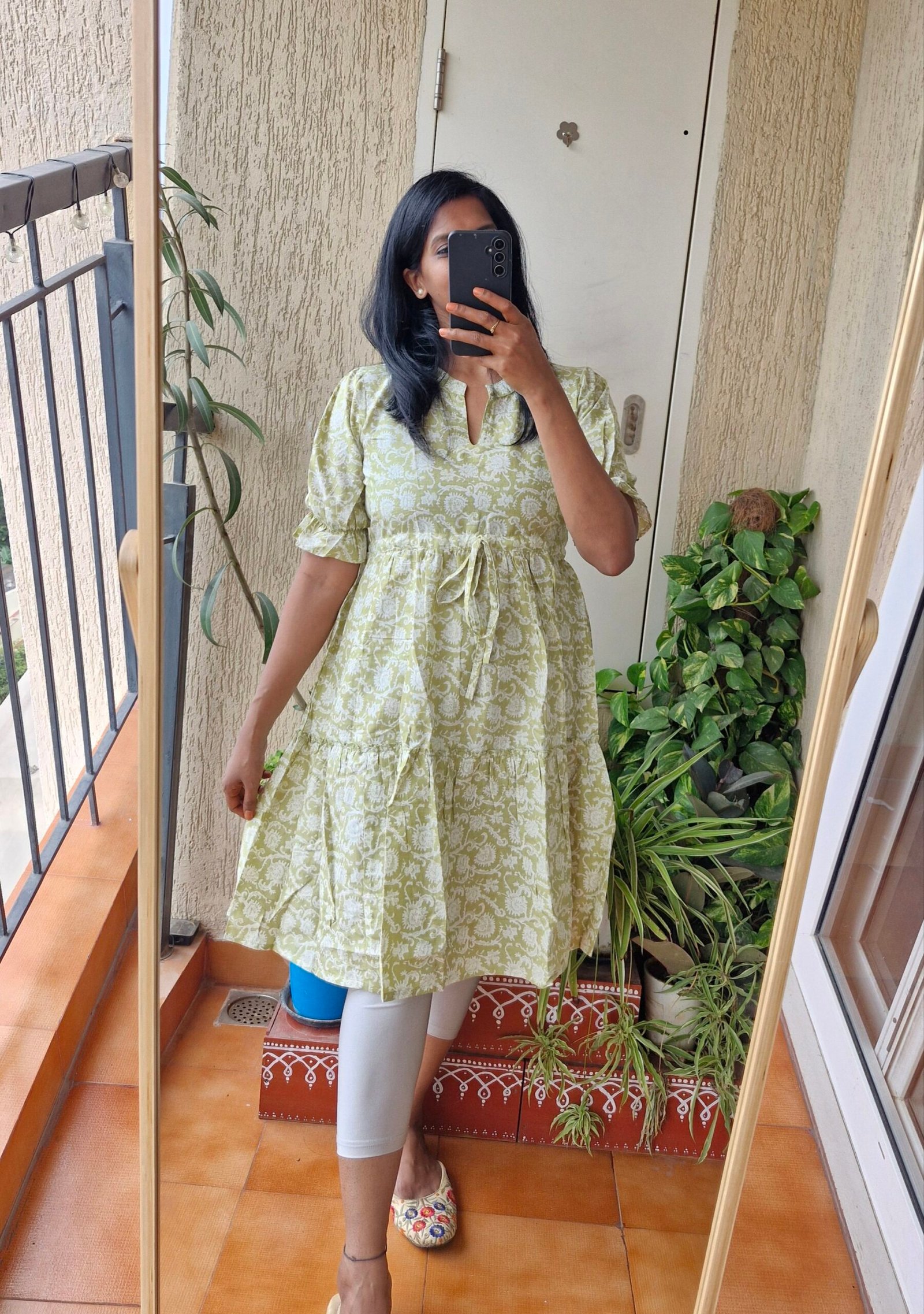 Beautiful lime green cotton dress come tunic with adjustable waist can be worn just like a dress or pair it with a legging or a Jean.Length of the dress is 40 inches.