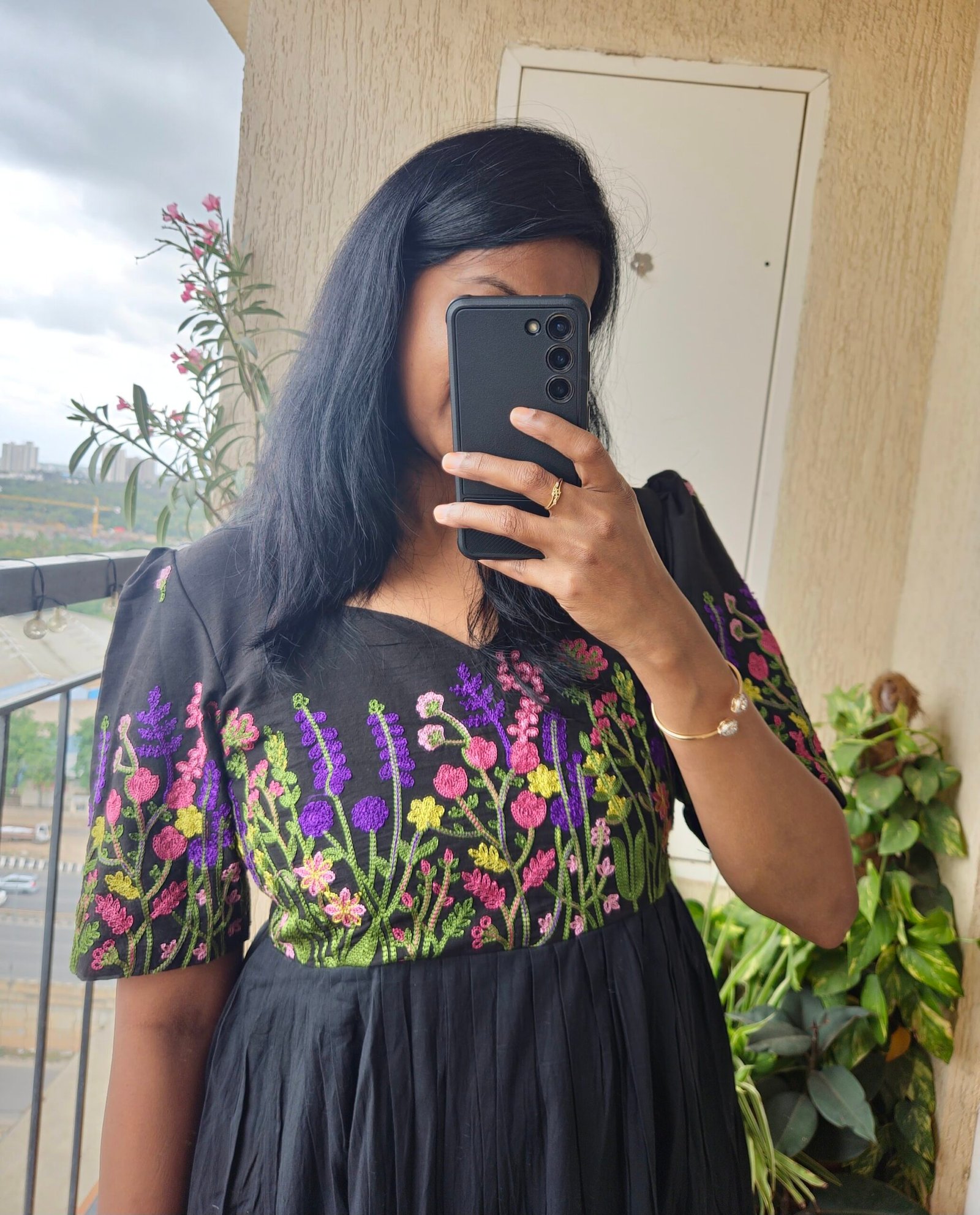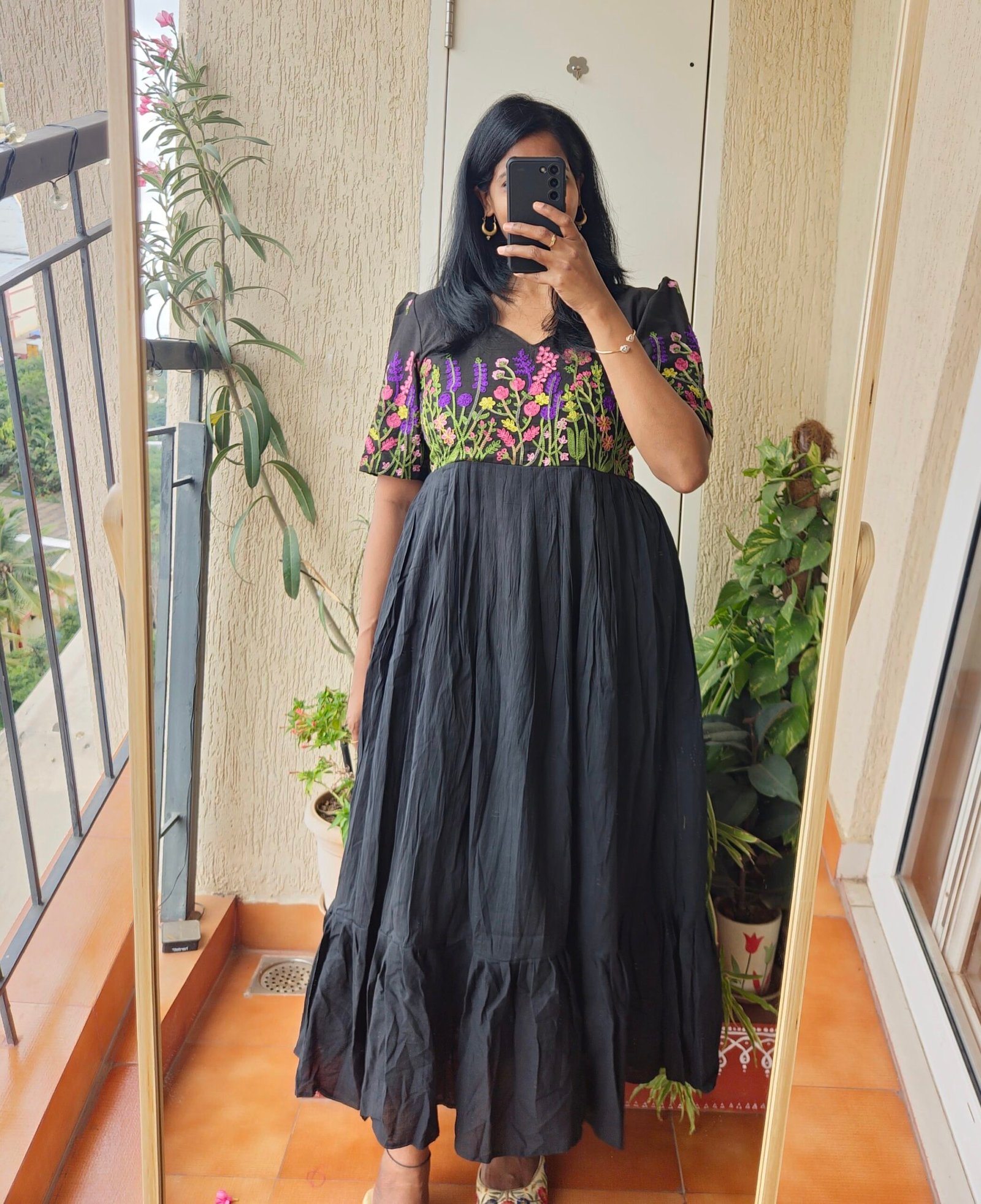 Noir black premium mul cotton dress with intricated embroidery on yoke and sleeves perfect for any ocassions and any season comes with a full lining. Length of the dress is 49 inches.