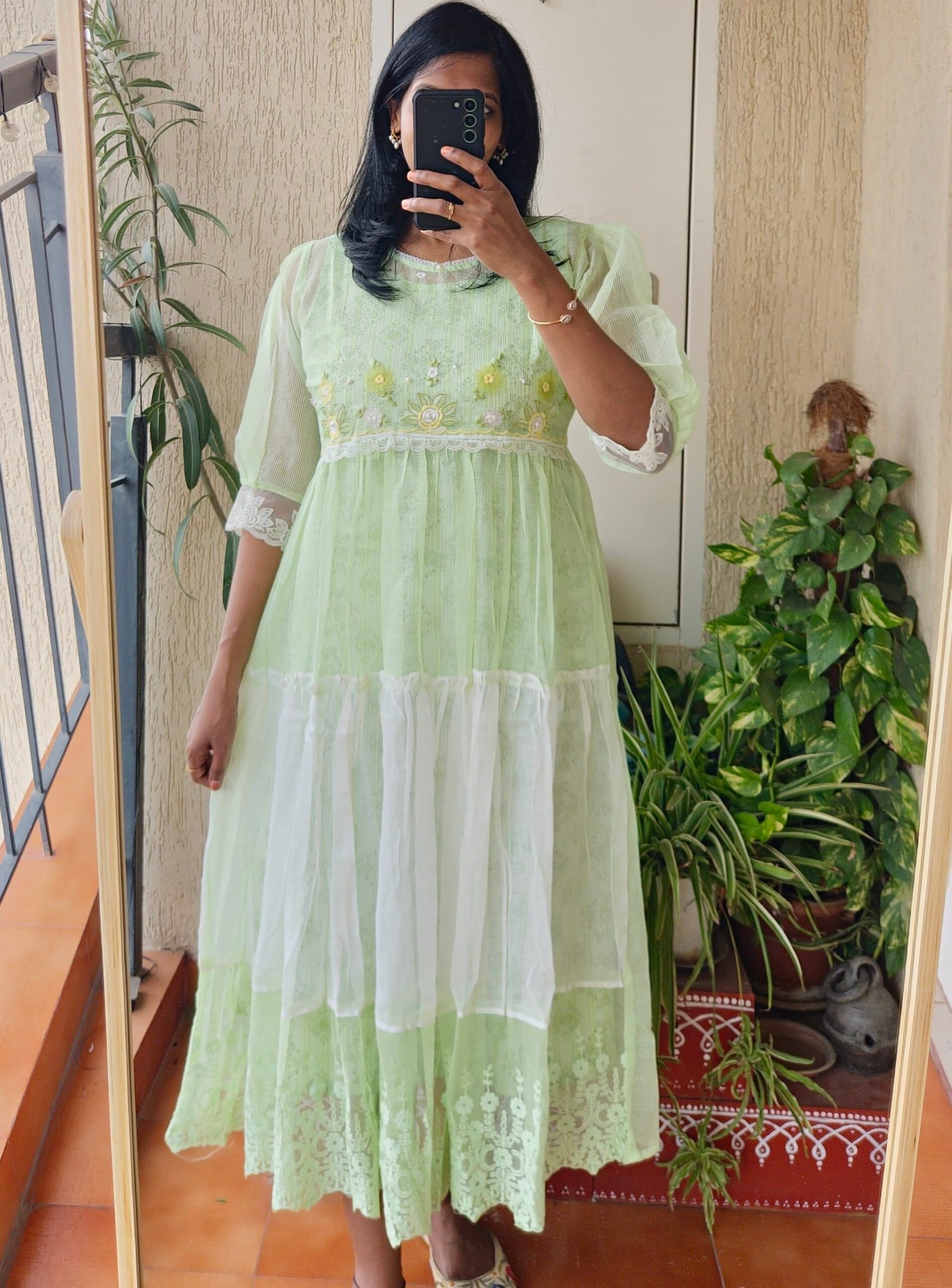 Pista kota dress comes with a two piece set comes with body hugging cotton inner to elevate the look. Stand out with this beautiful classy piece . Length of the dress 47 inches.