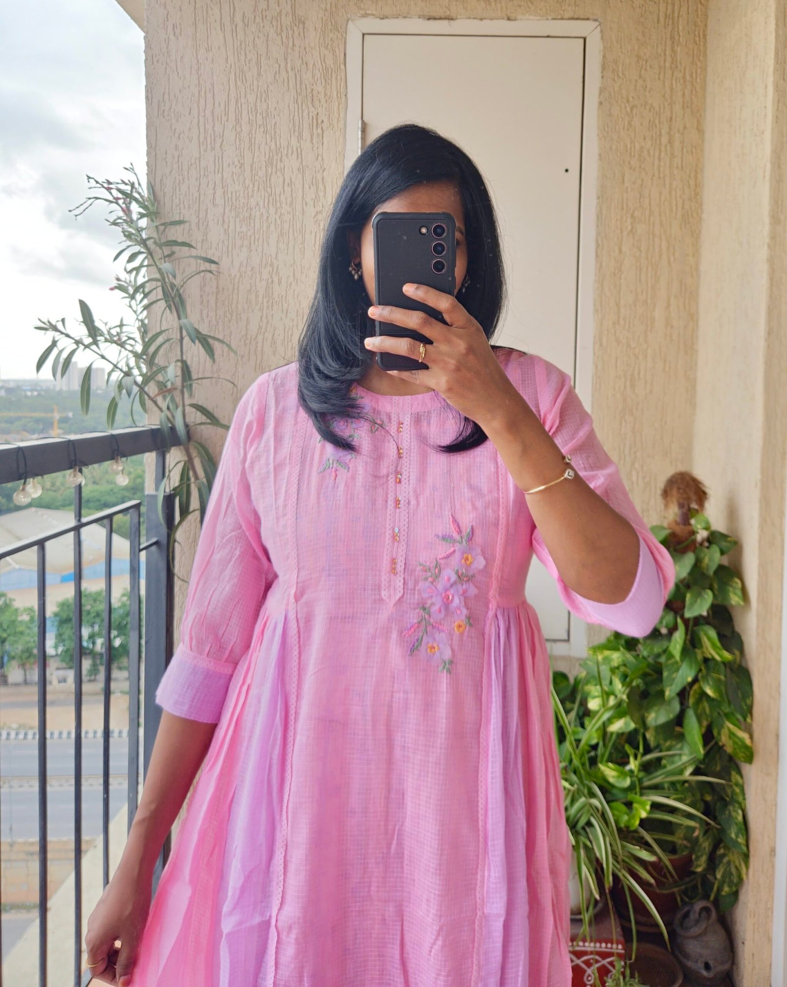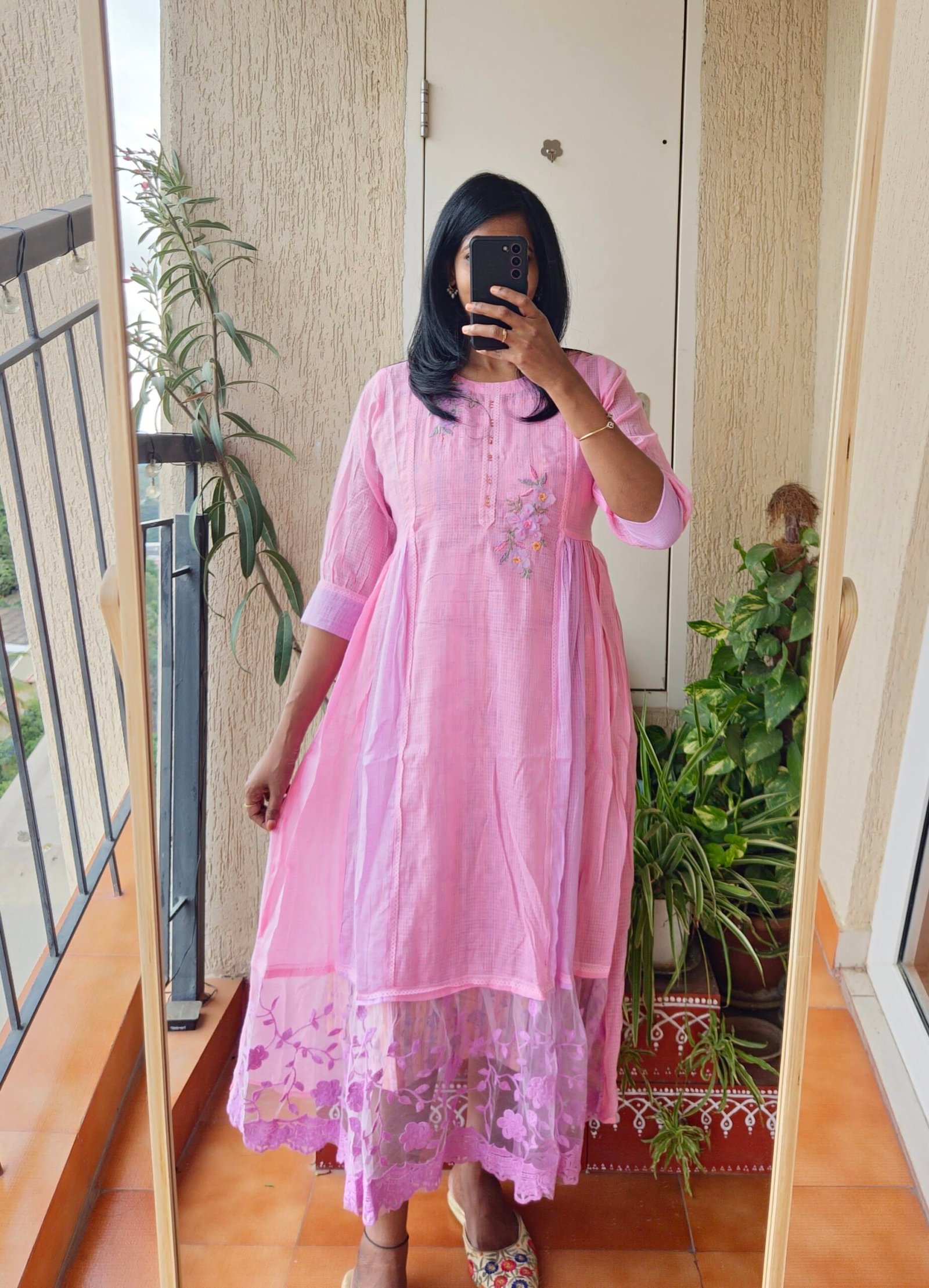 Pink kota dress comes with a two piece set comes with body hugging cotton inner to elevate the look. Stand out with this beautiful classy piece . Length of the dress 47 inches.