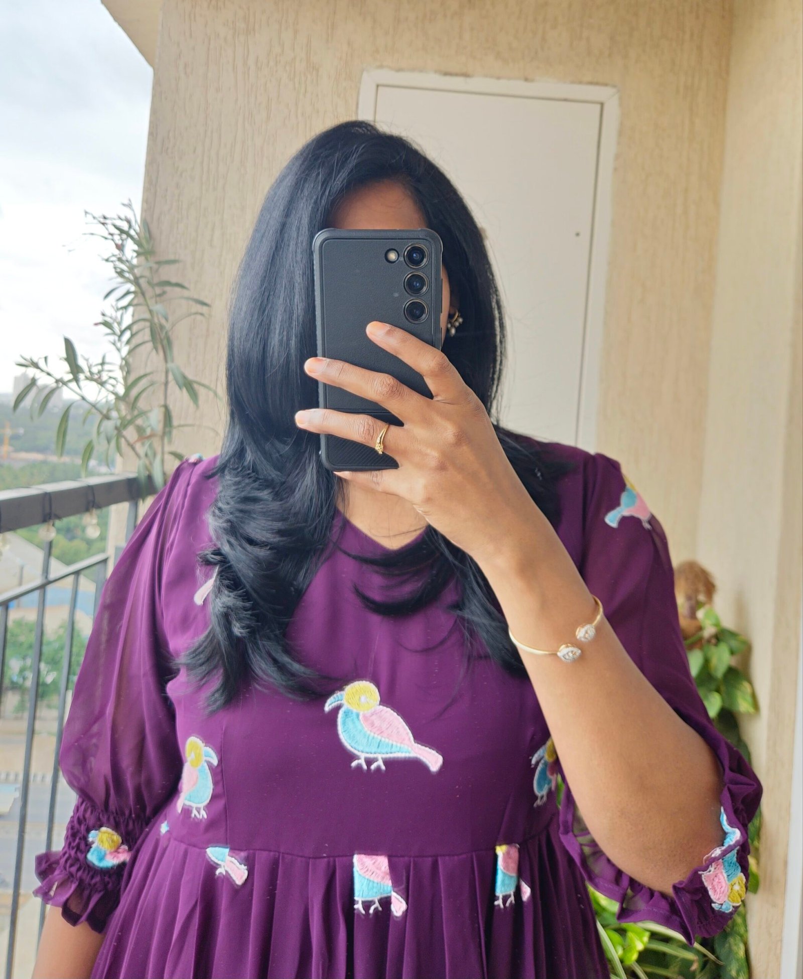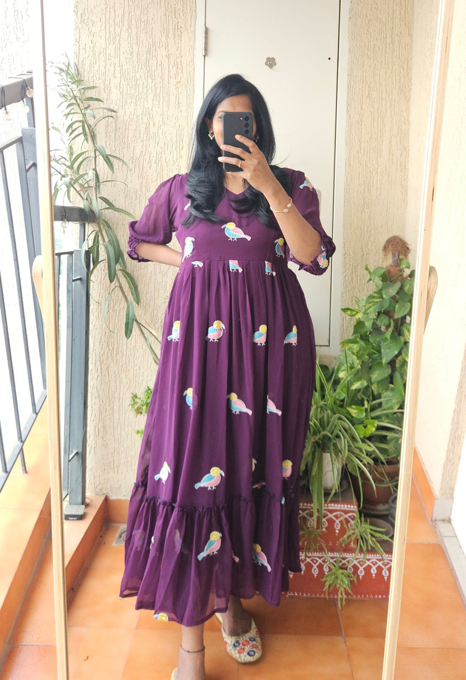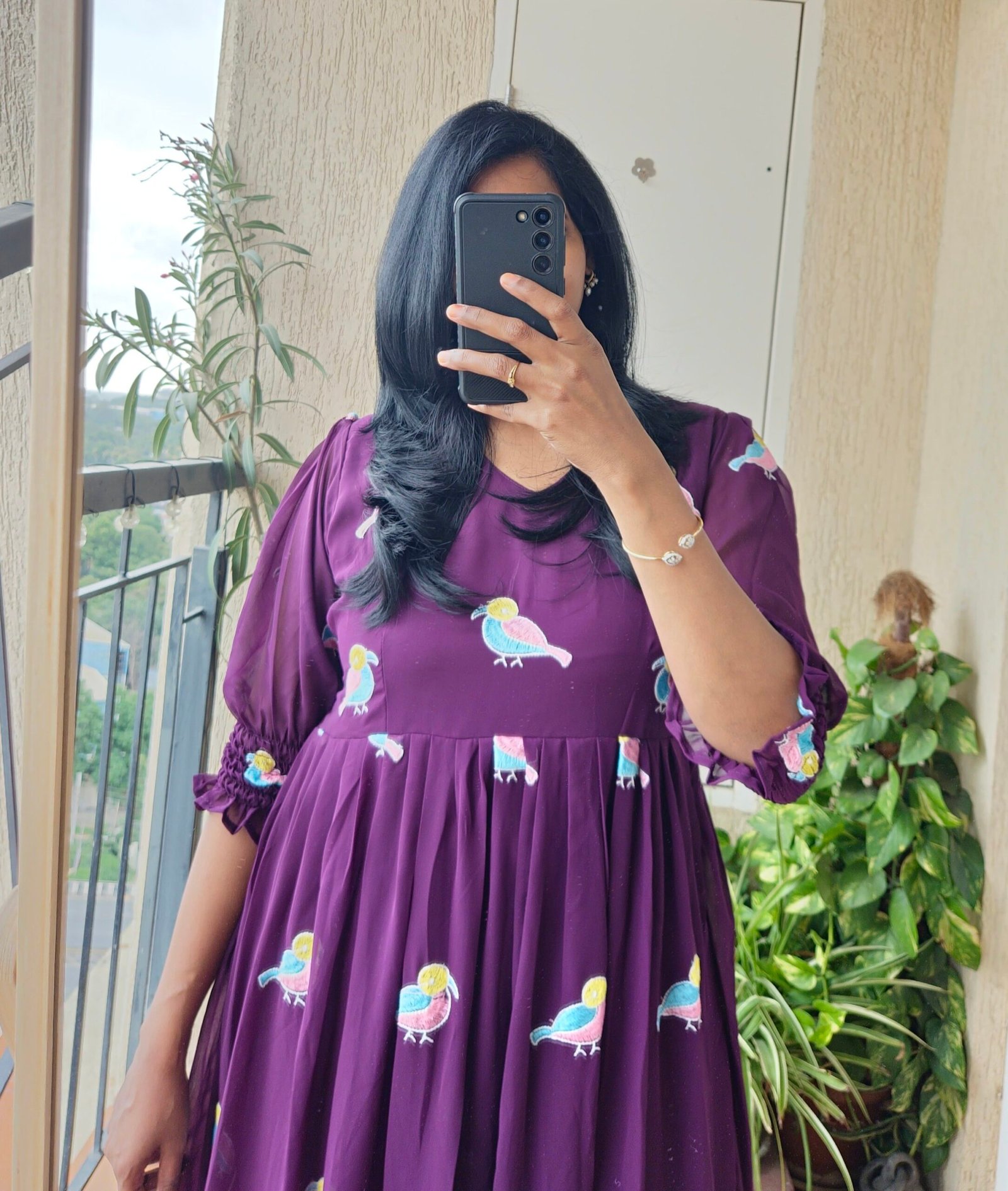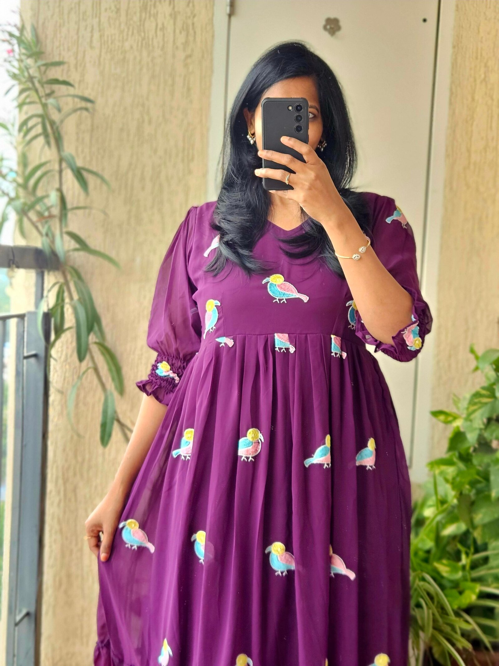Birdie purple georgette dress with beautiful bird thread work allover the dress. Perfect fit comes with a zip. True to size.Length of the dress 50 inches.