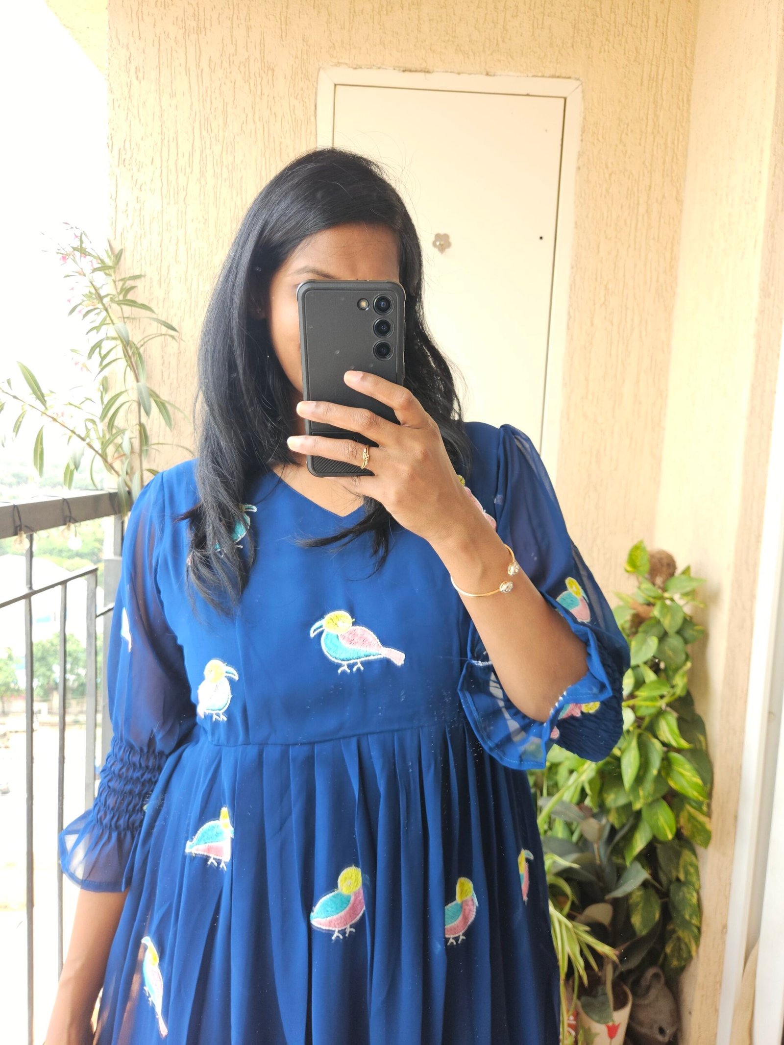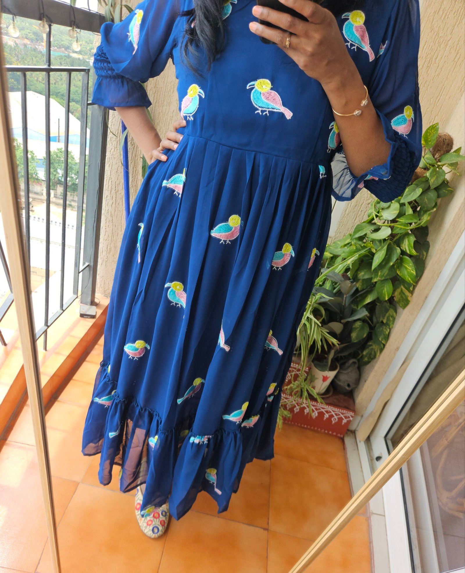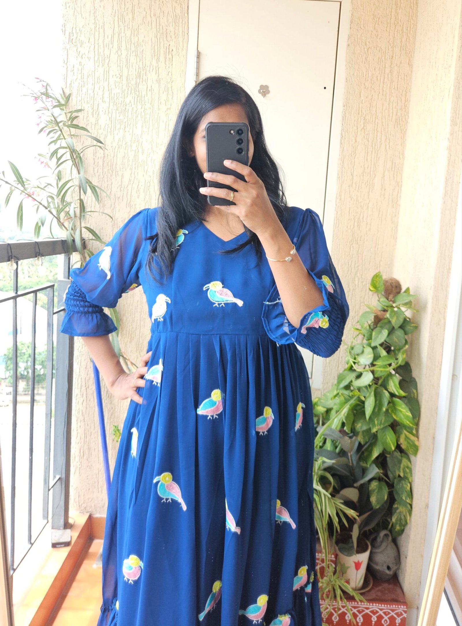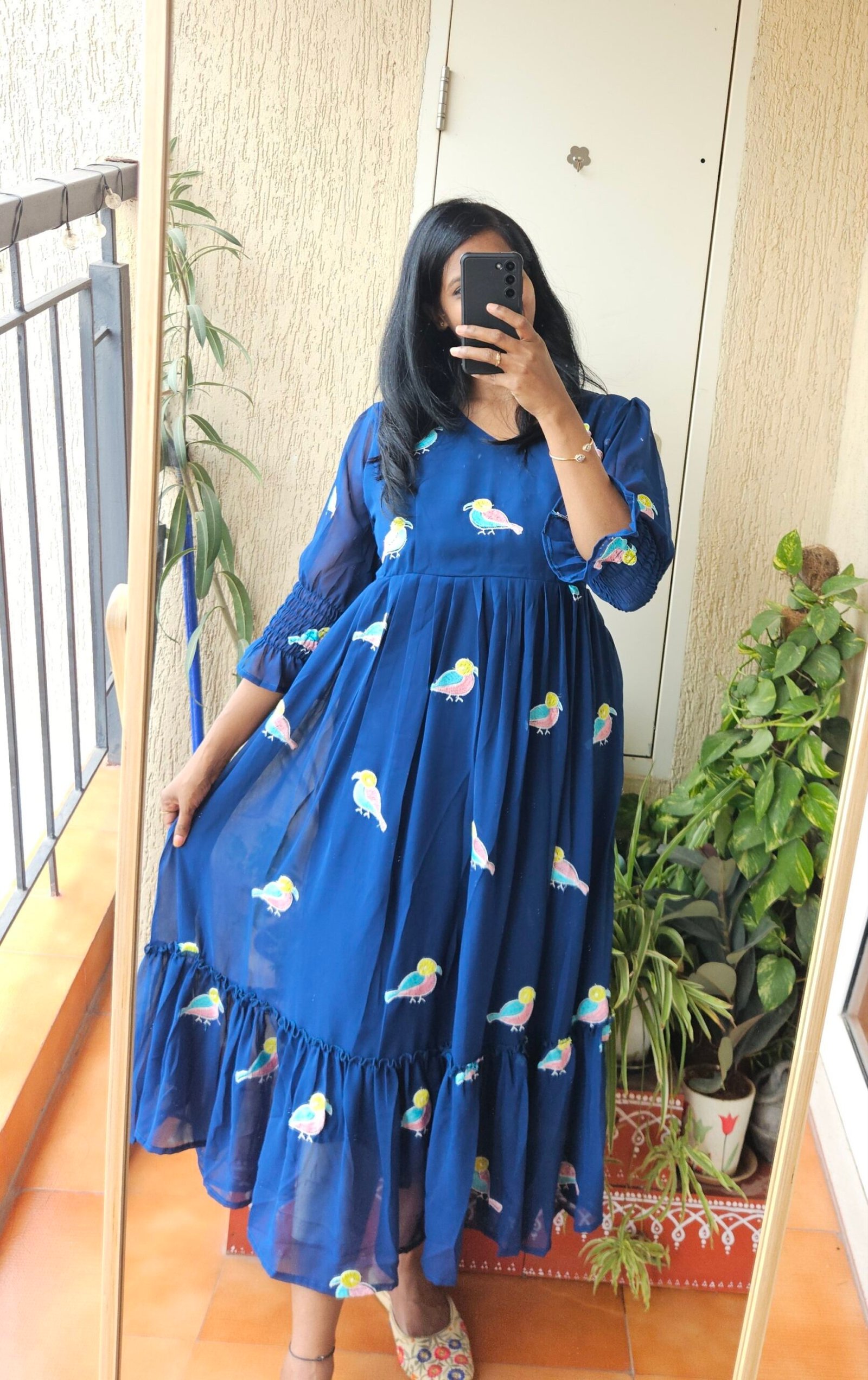 Birdie blue georgette dress with beautiful bird thread work allover the dress. Perfect fit comes with a zip. True to size.Length of the dress 50 inches.