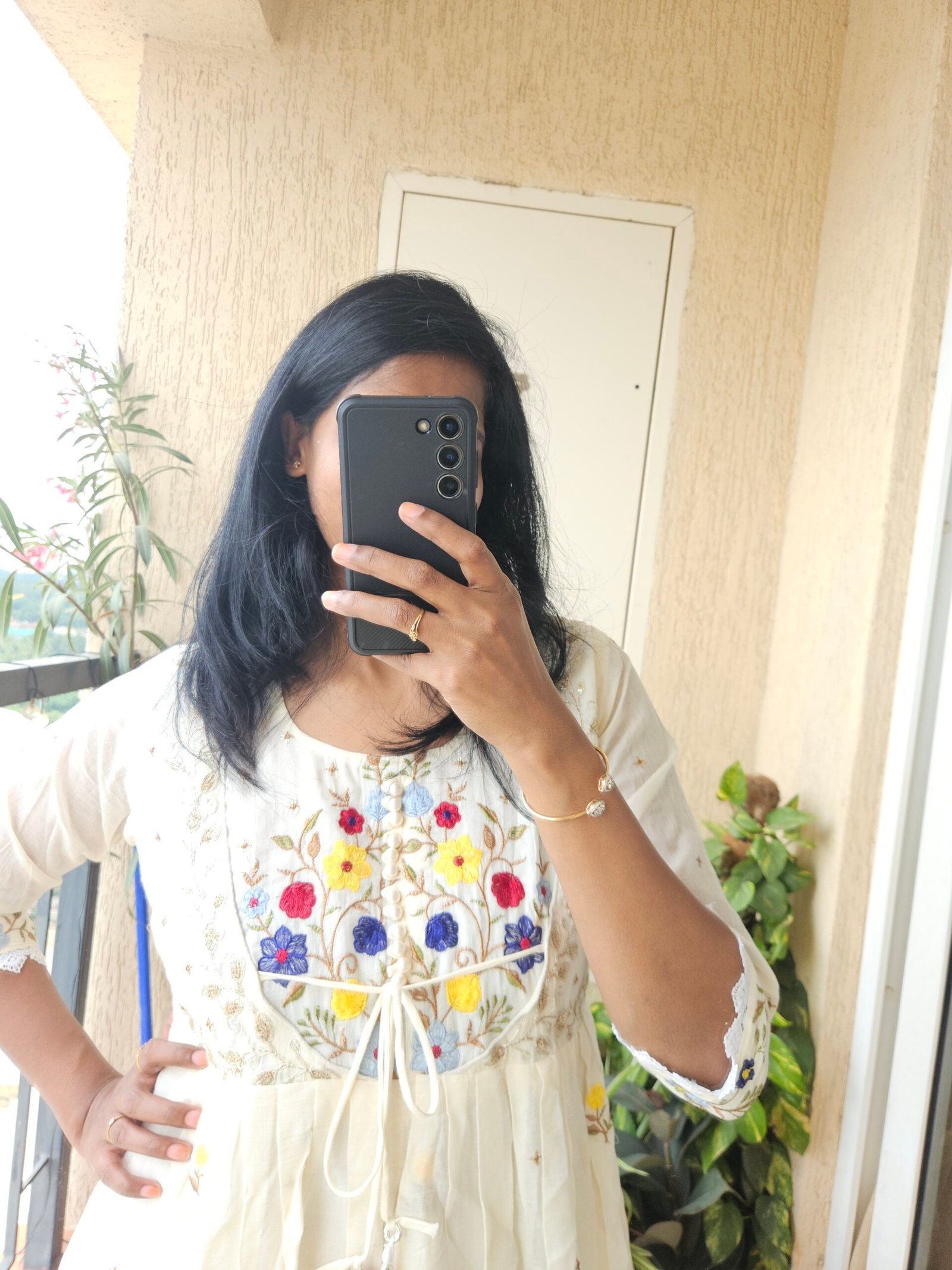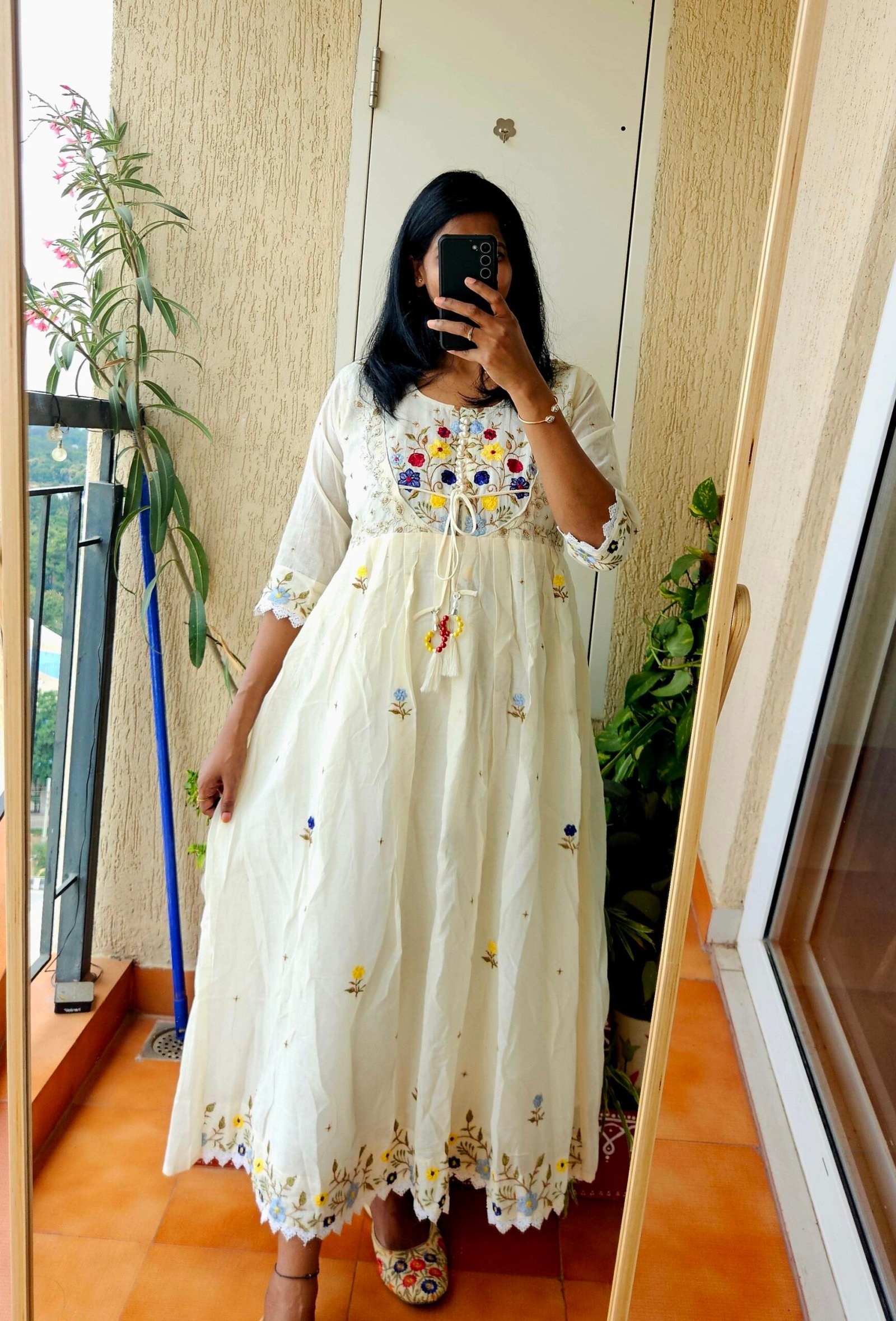 Half white Mul cotton kurta. awith beautiful embroidery all over. perfect for any occassion. Length 50 inches.