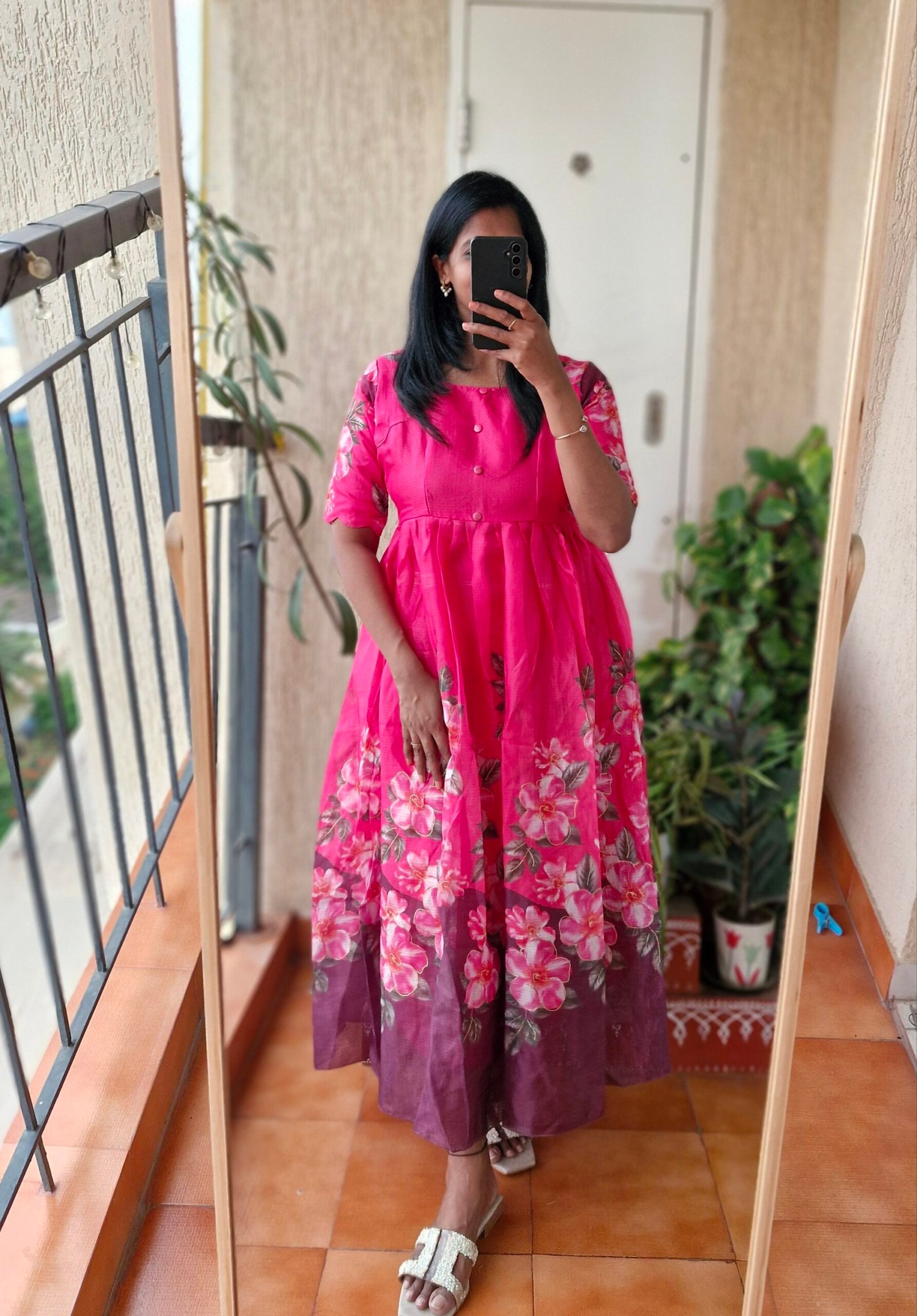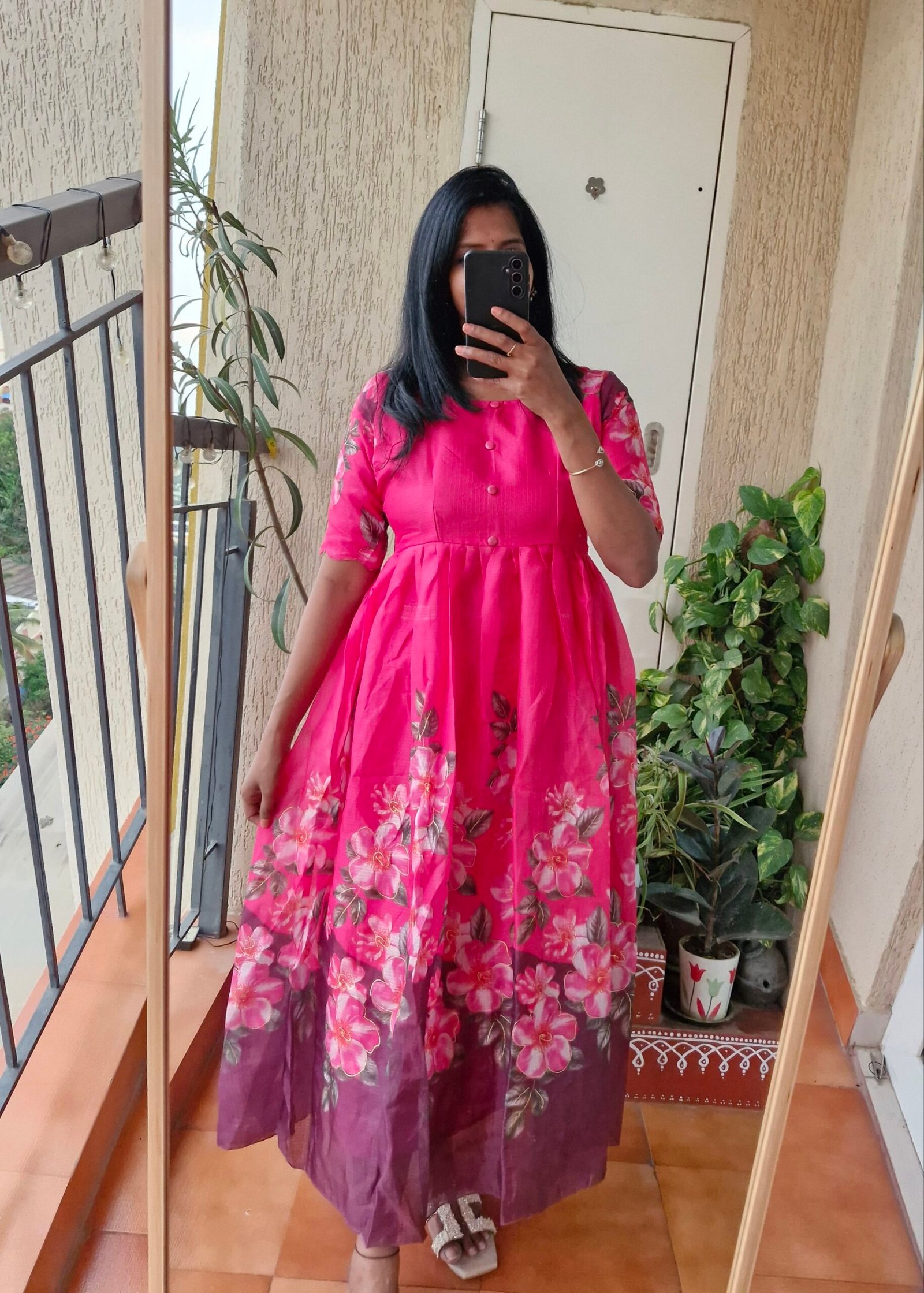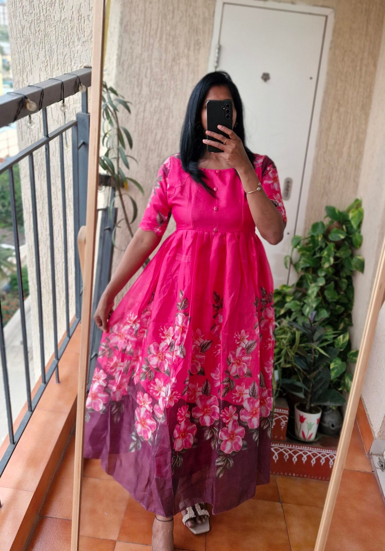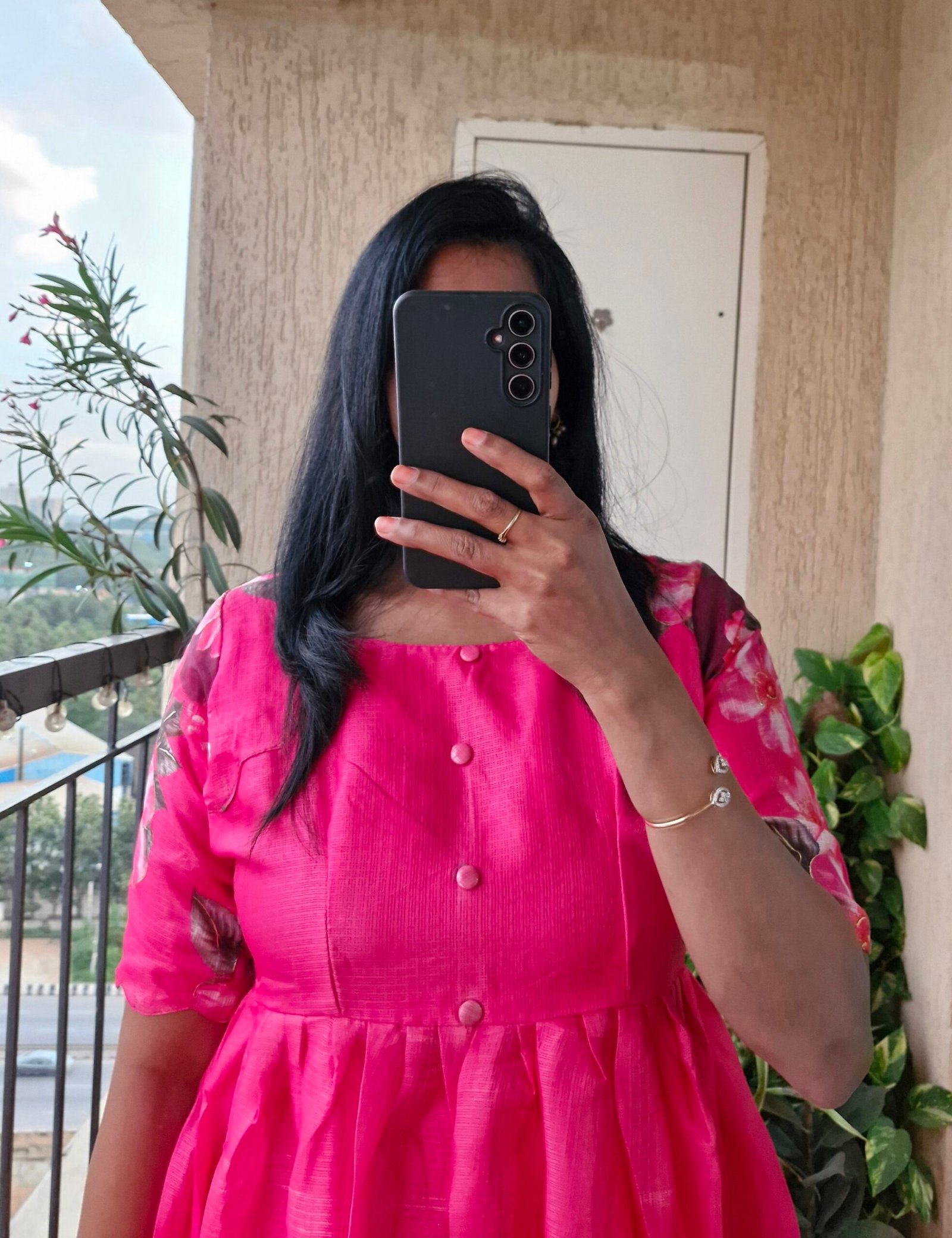 Beautiful pink kota budget friendly dress with beaitiful scallop pattern on neck and sleeves .Length of the dress 50 inches.