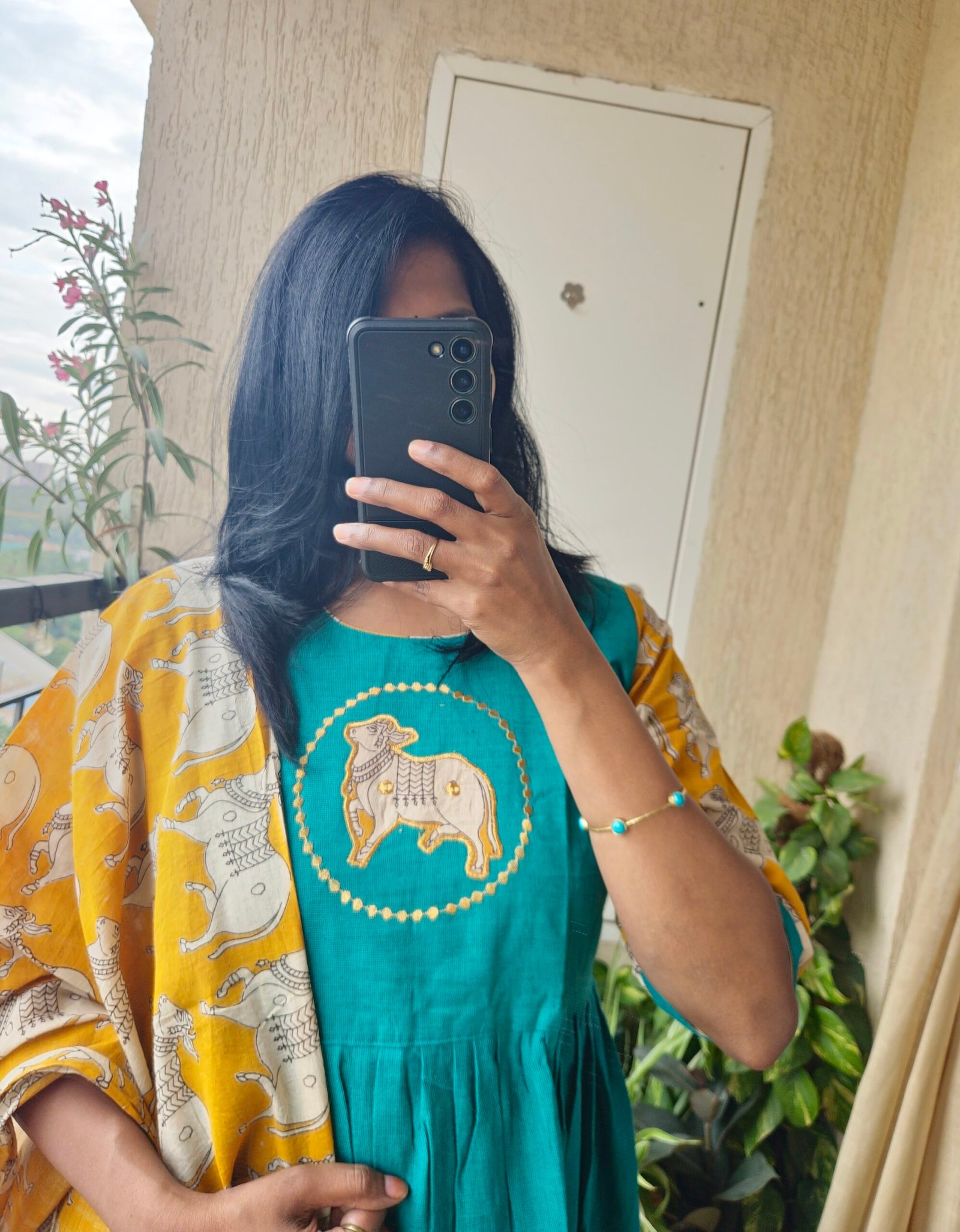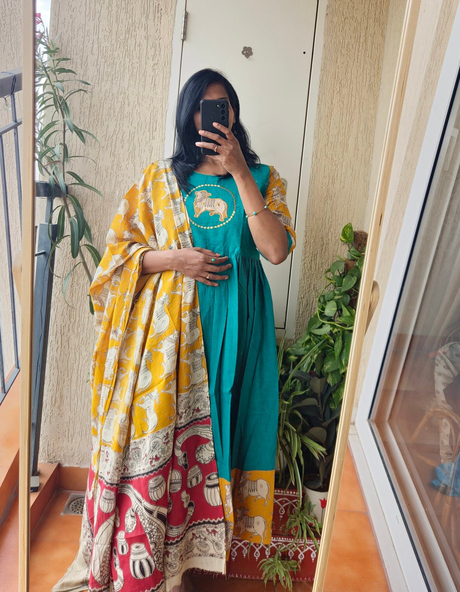 Teal Mangalgiri cotton kurta set with beautuful Nandi applique work on yoke part and bottom line. Comes with top and dhupatta.Length of the dress is 46 inches.