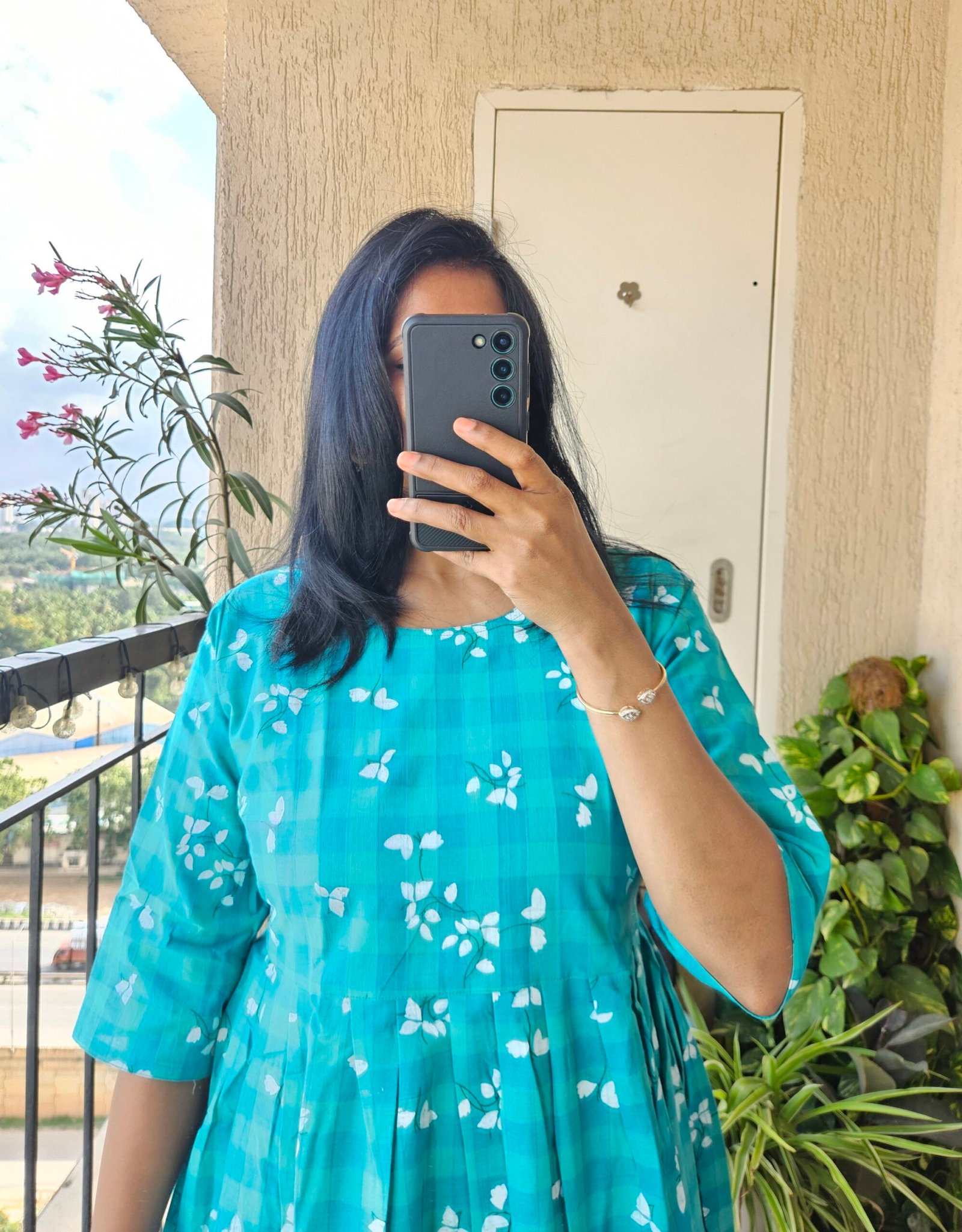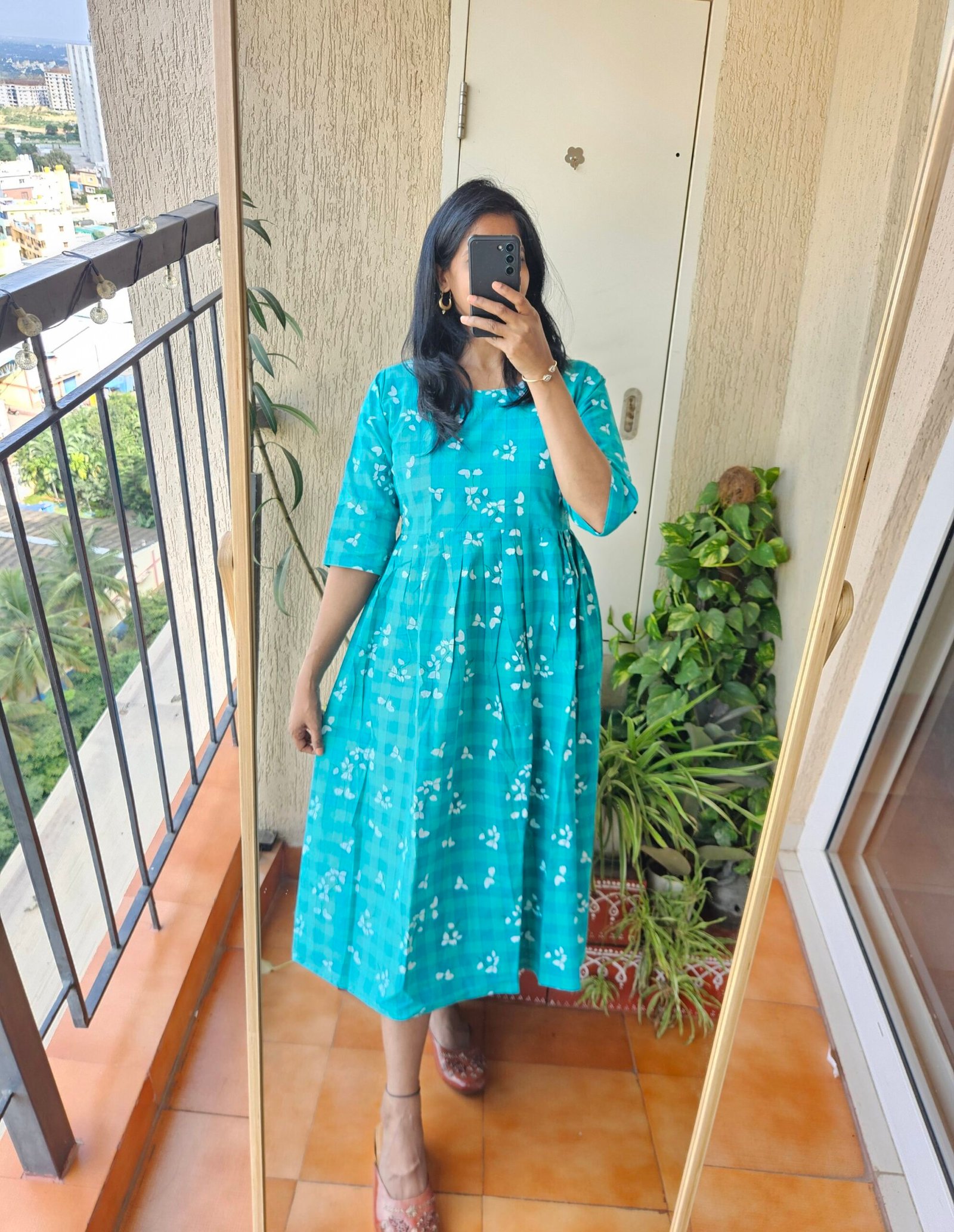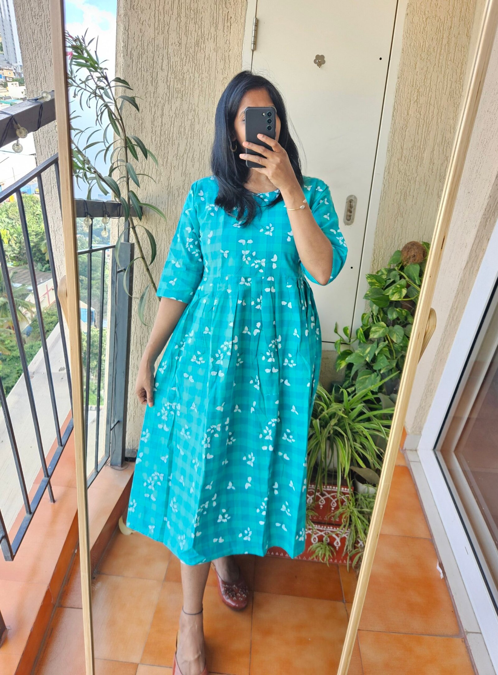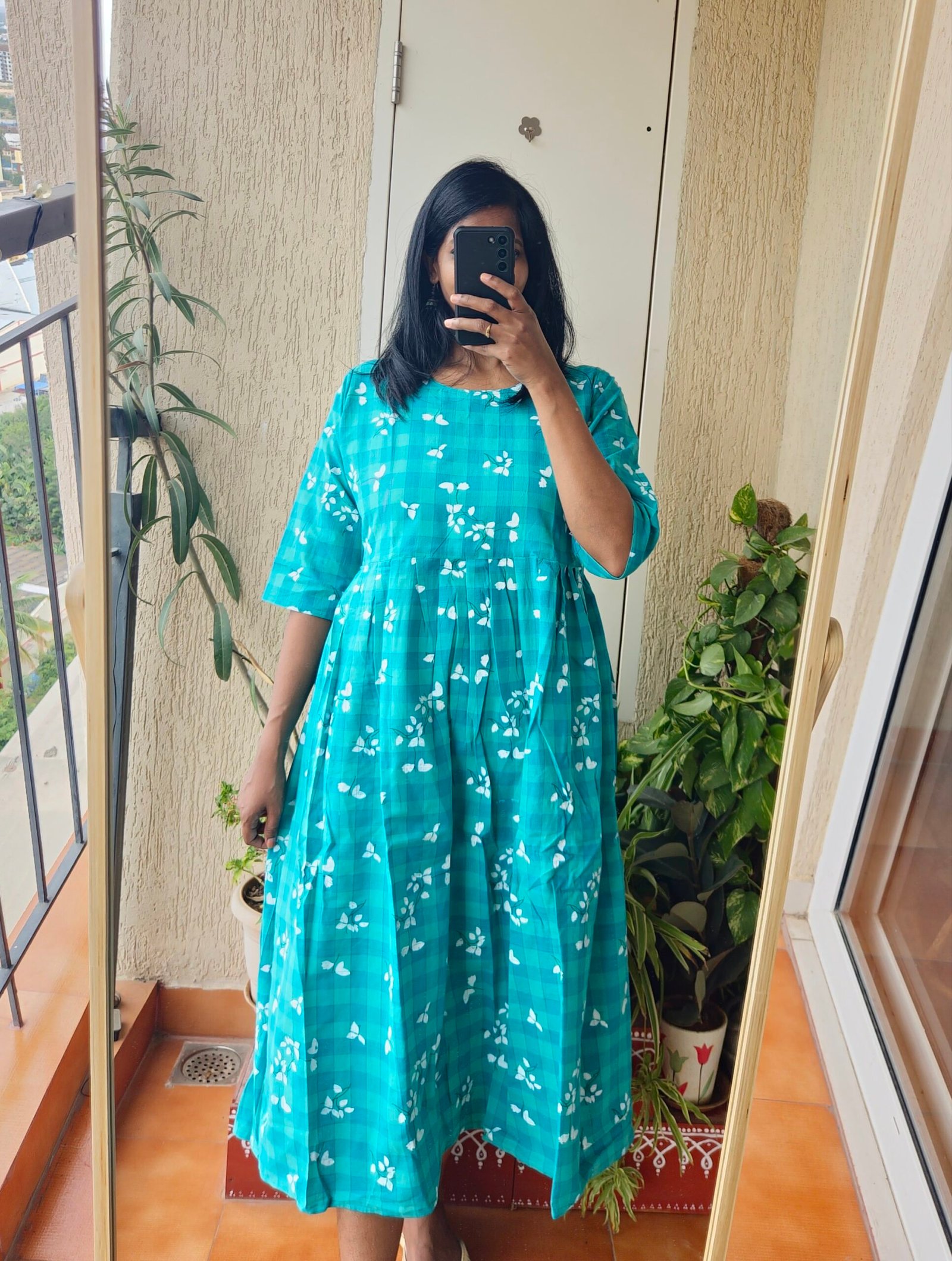 Rama green cotton floral checks frock. Length – 46 inches.