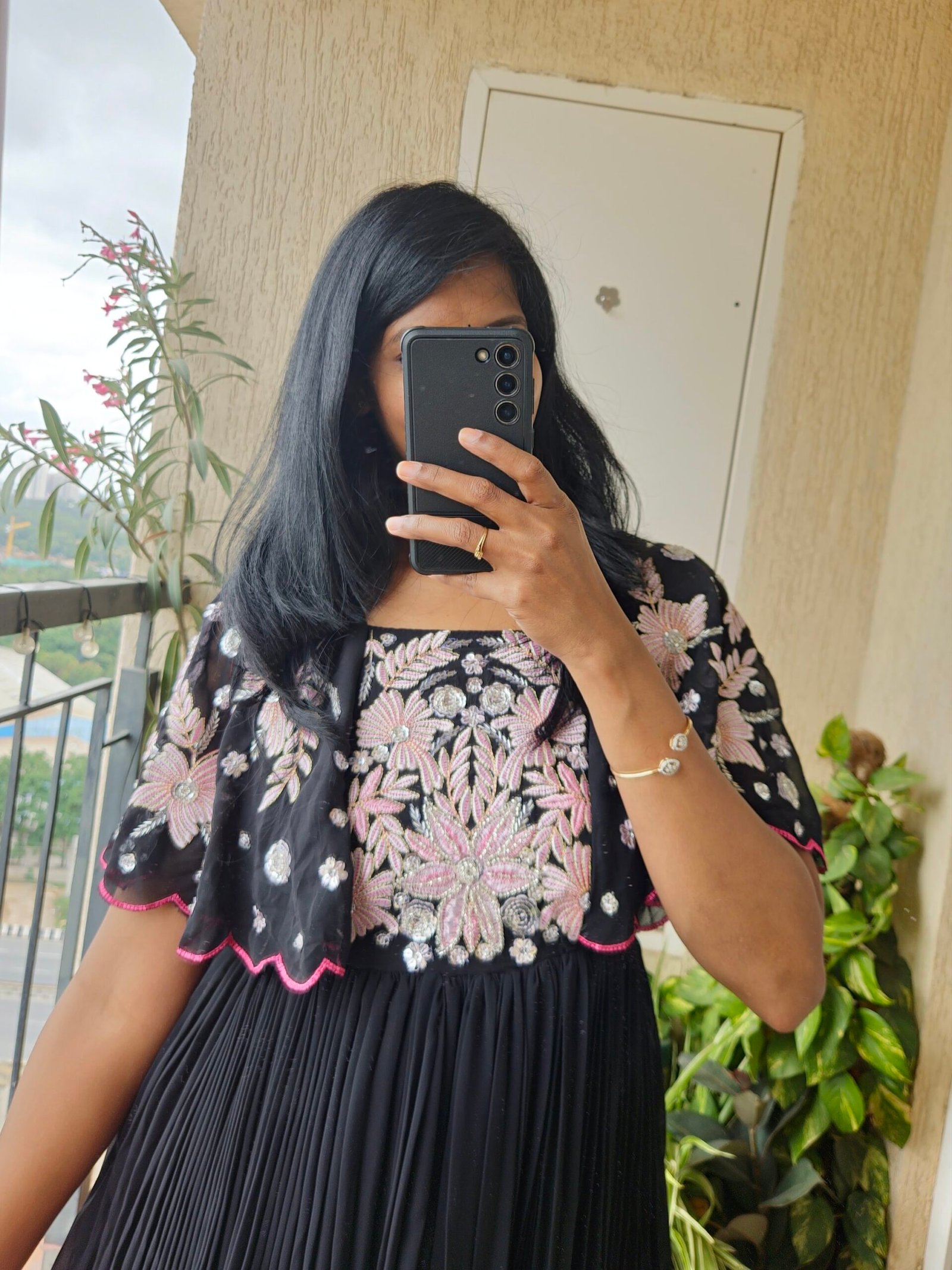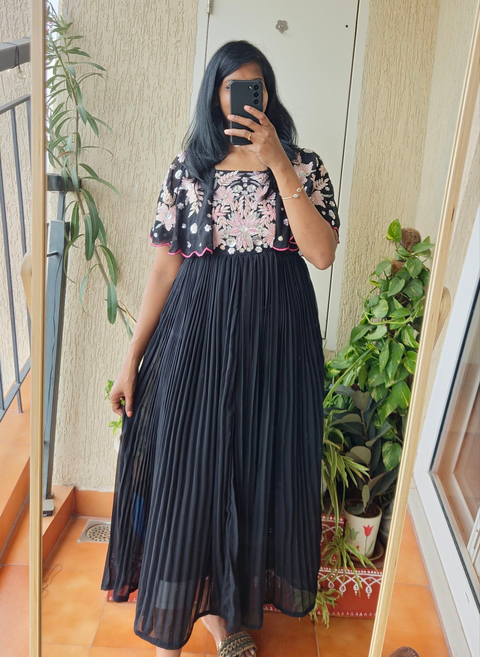 Black georgette gown with pleated frills and beautiful cape embroidery. perfect for simple parties and family ocassions. Length of the dress is 48 inches.