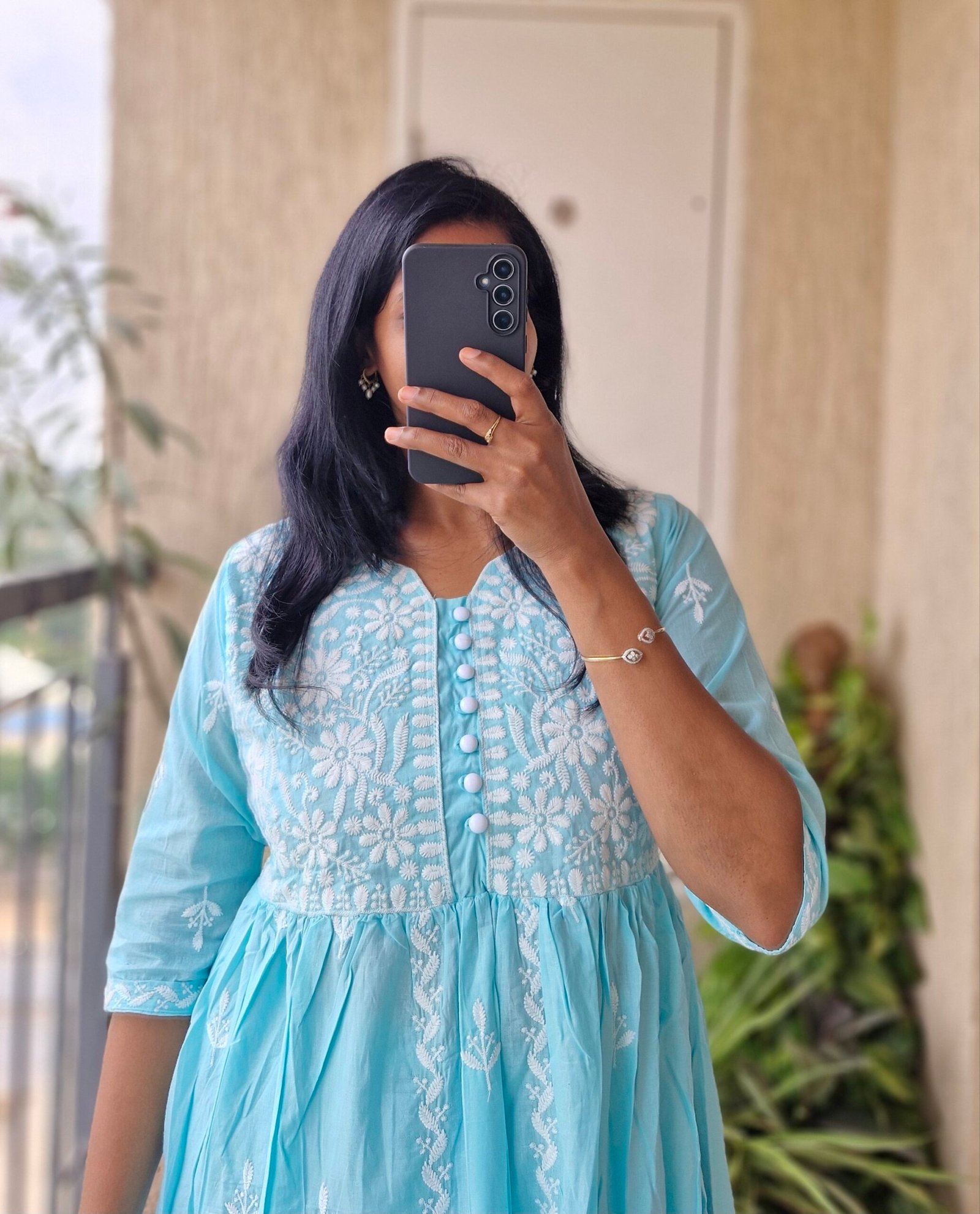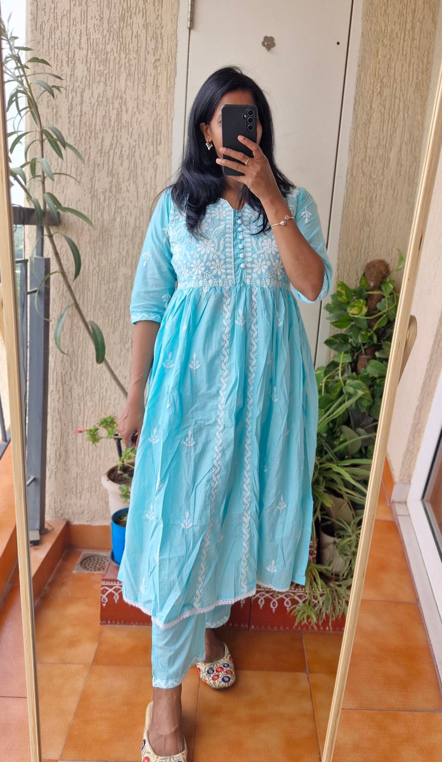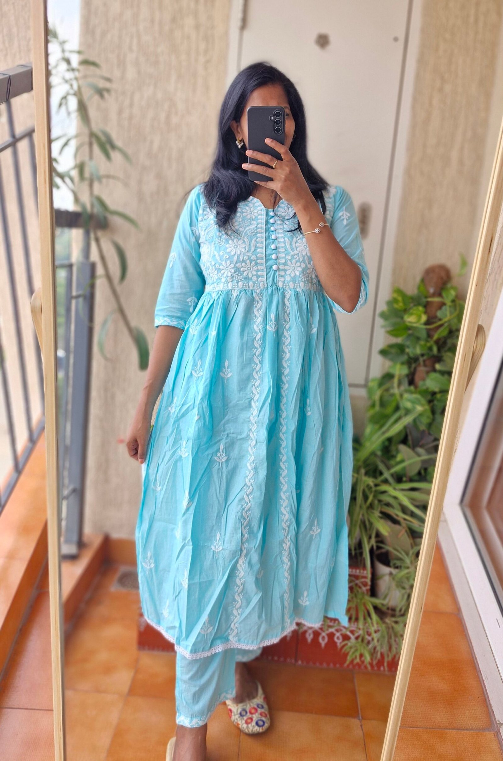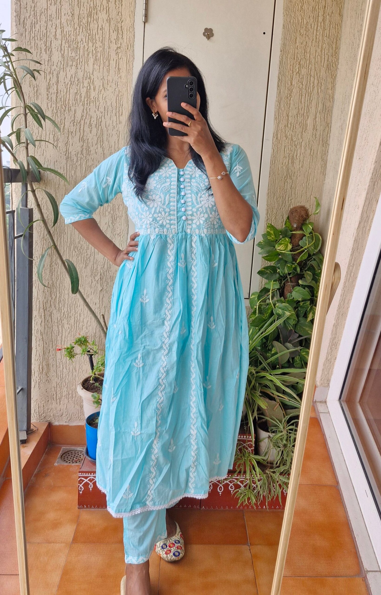 Blue Lucknowi cotton co-ord set .Colour will be slightly lighter than the pictures.Length of the top is 46 inches.