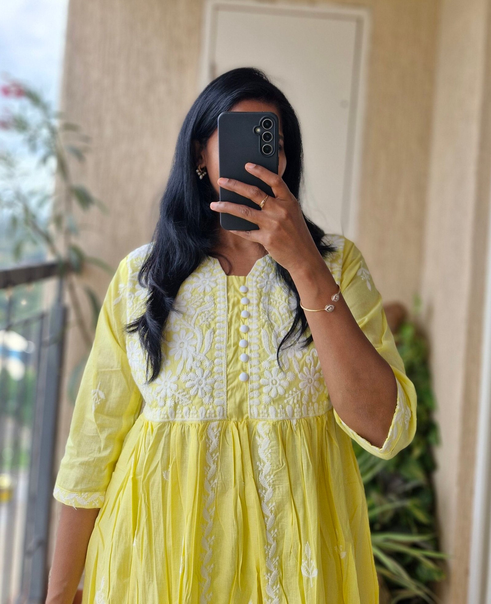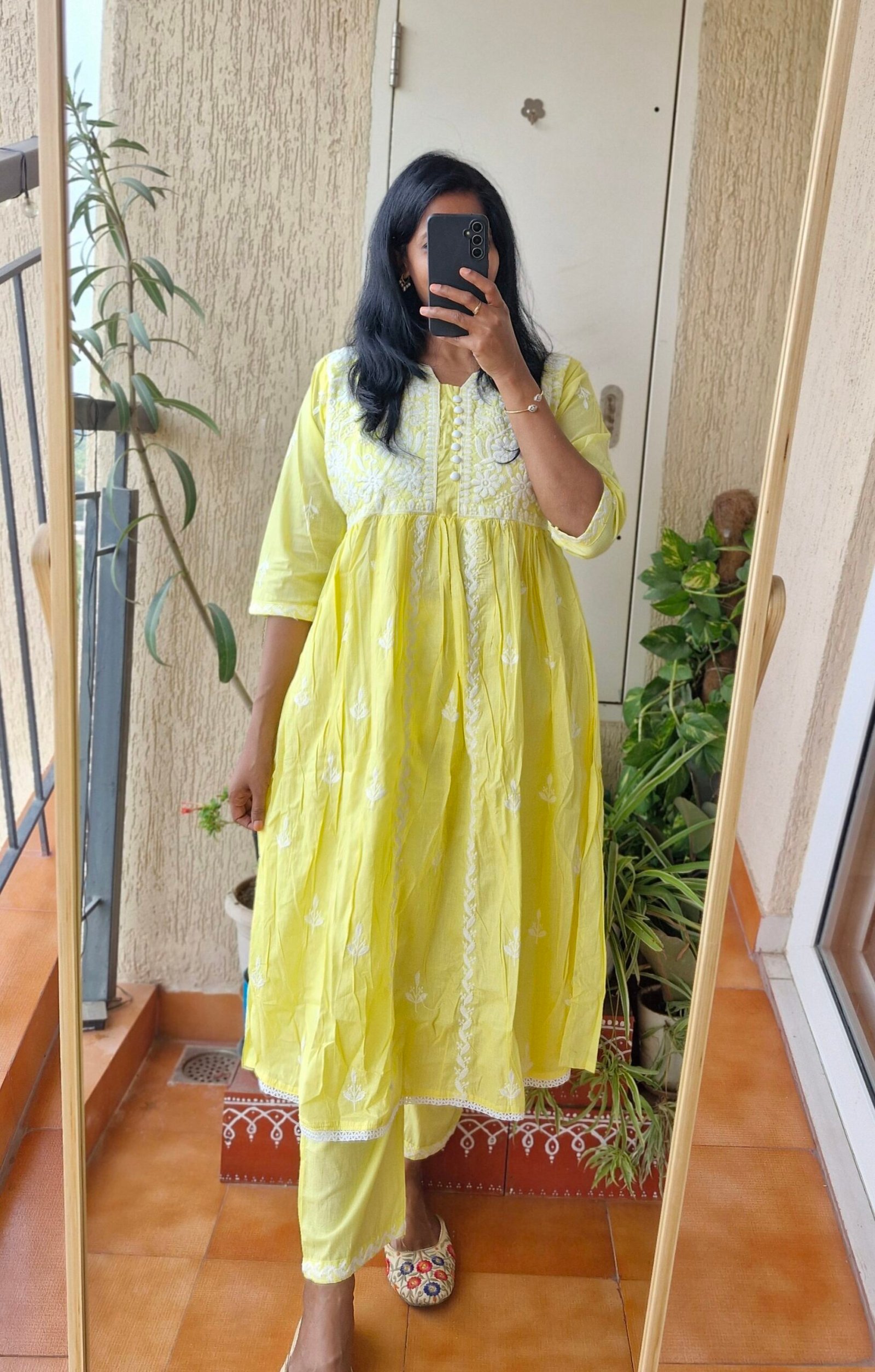 Yellow Lucknowi co-ord set .Length of the top is 46 inches.