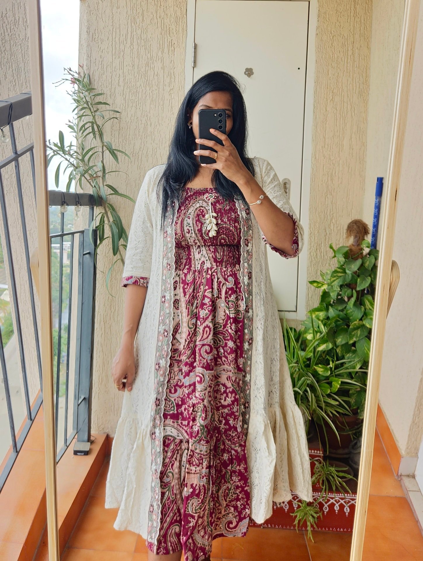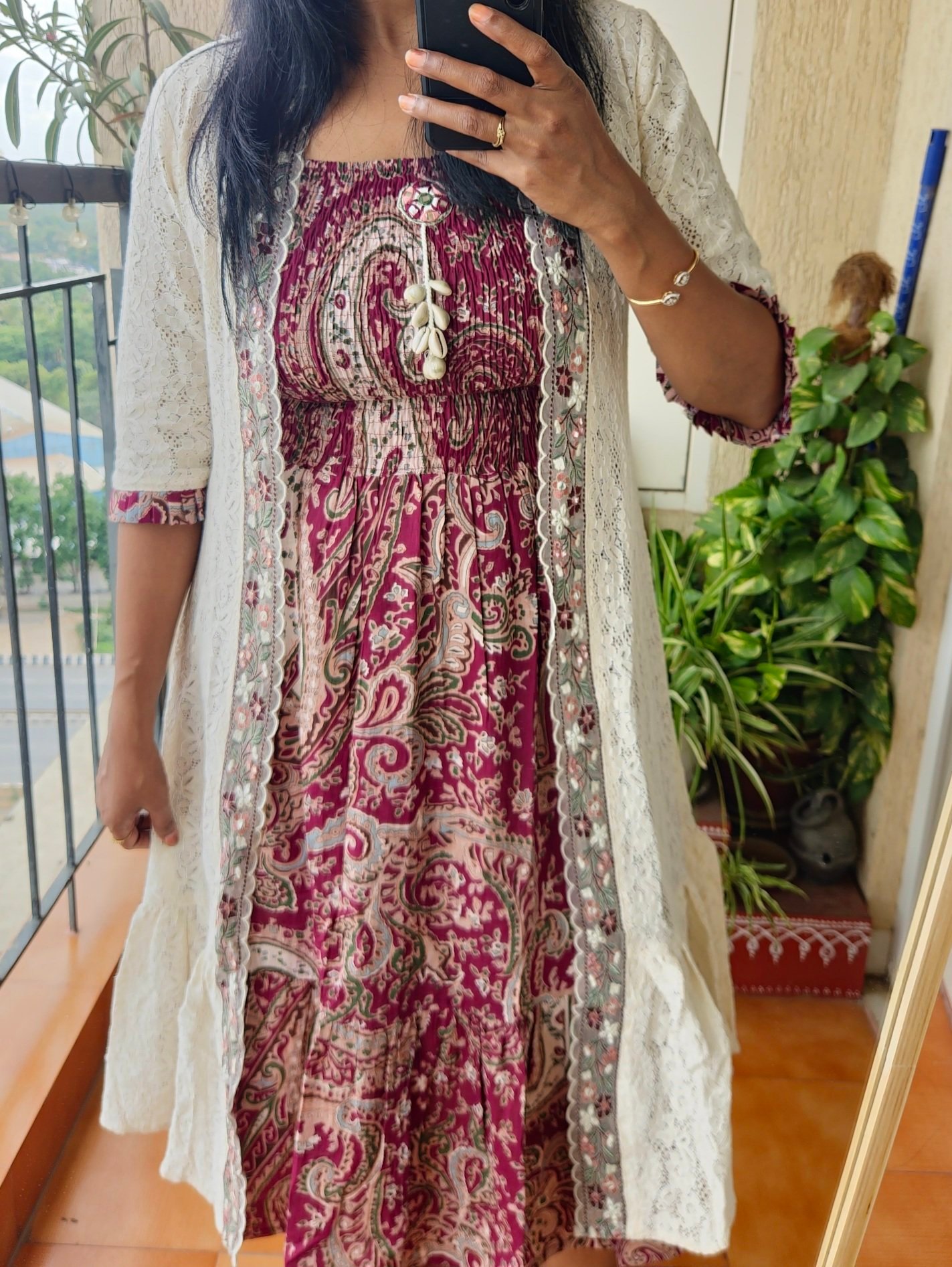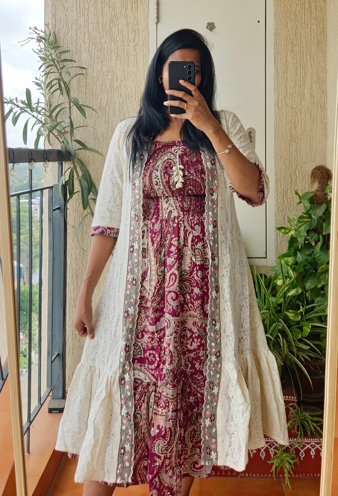 Comes with premium jacket can pair it with any dress or jeans and comes with a premium rayon smoked detailing inner perfect for go to brunches. Length 46 inches.