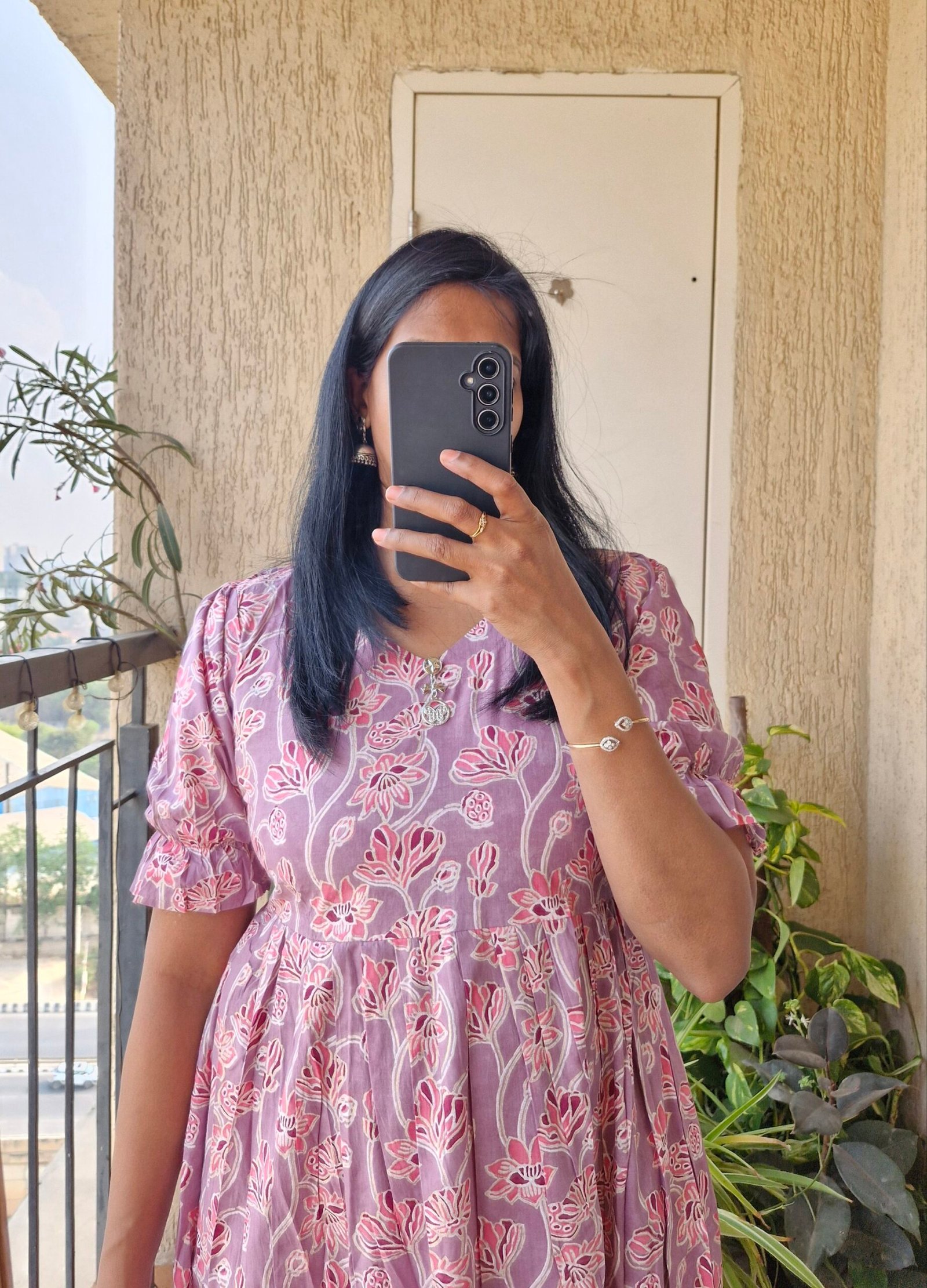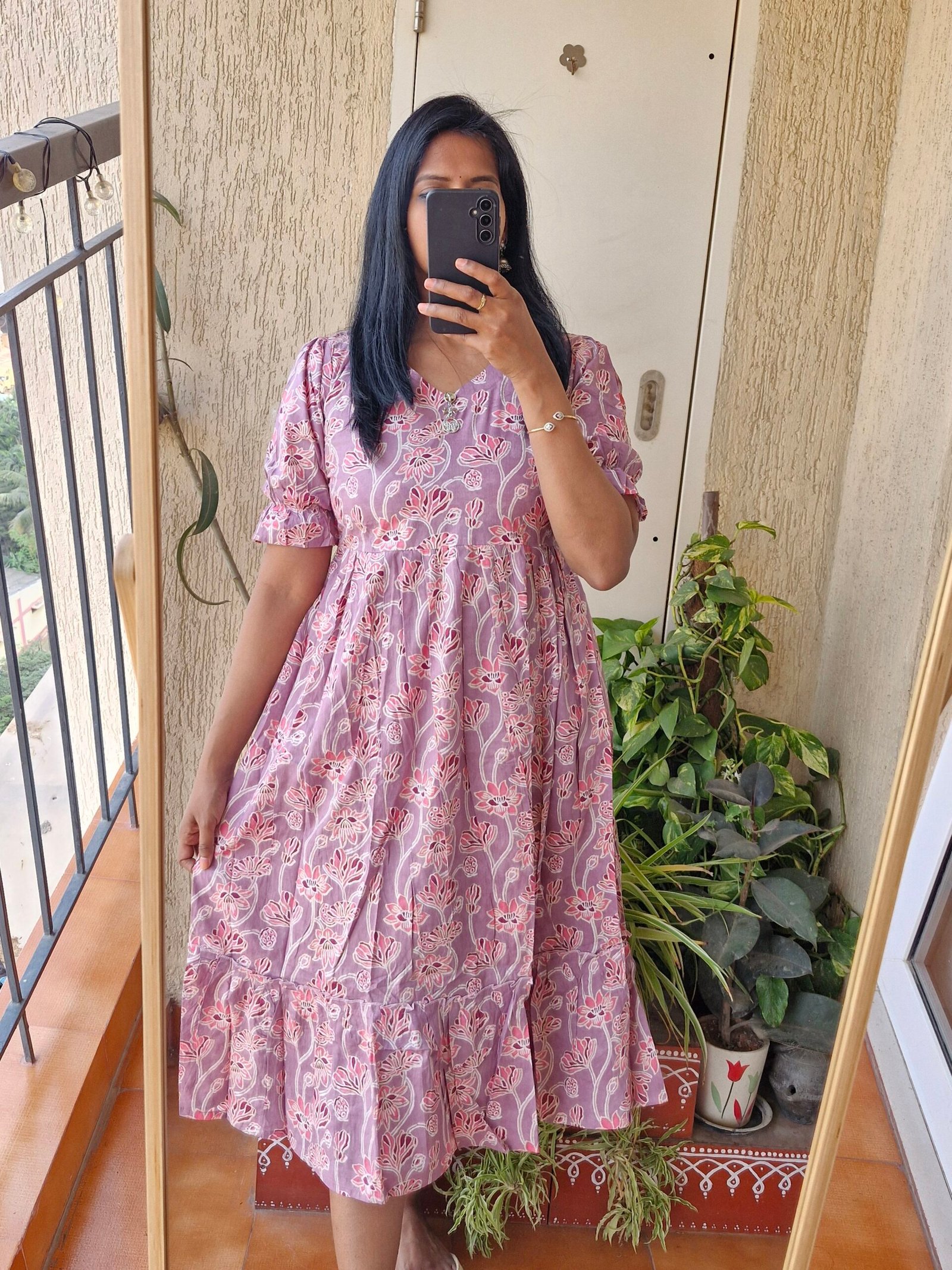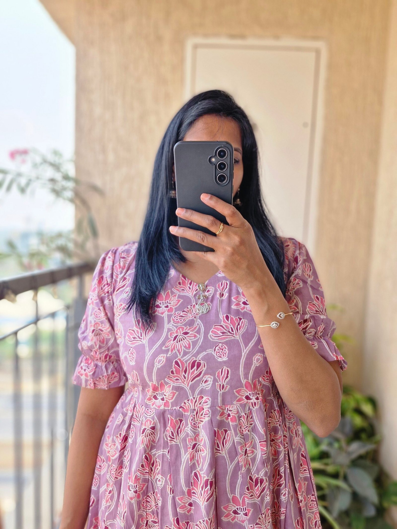 Beautiful Lilac floral Vatican silk dress comes with a detachable pin on yoke part. Length of the dress is – 45 inches. Please choose as per your bust size.
