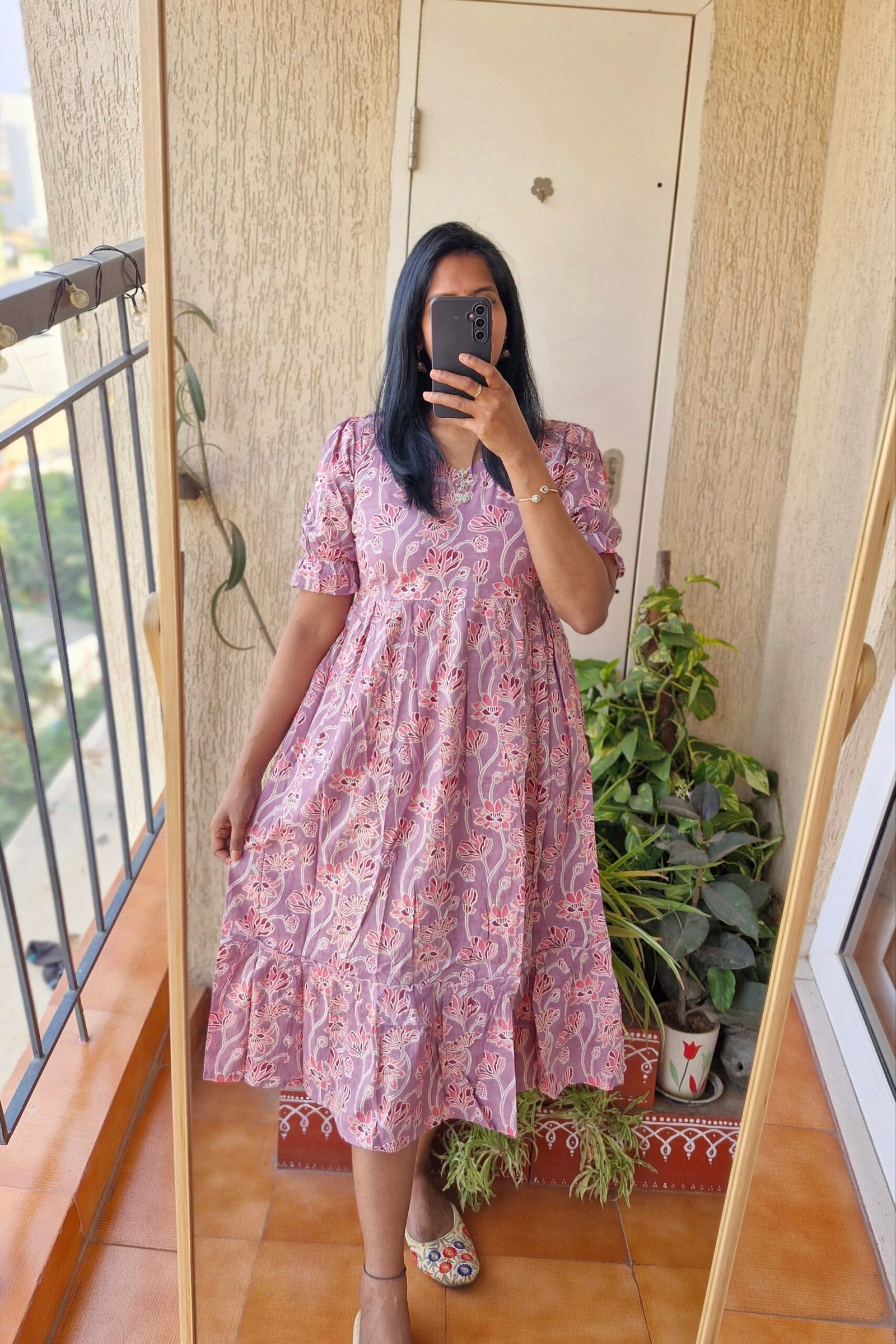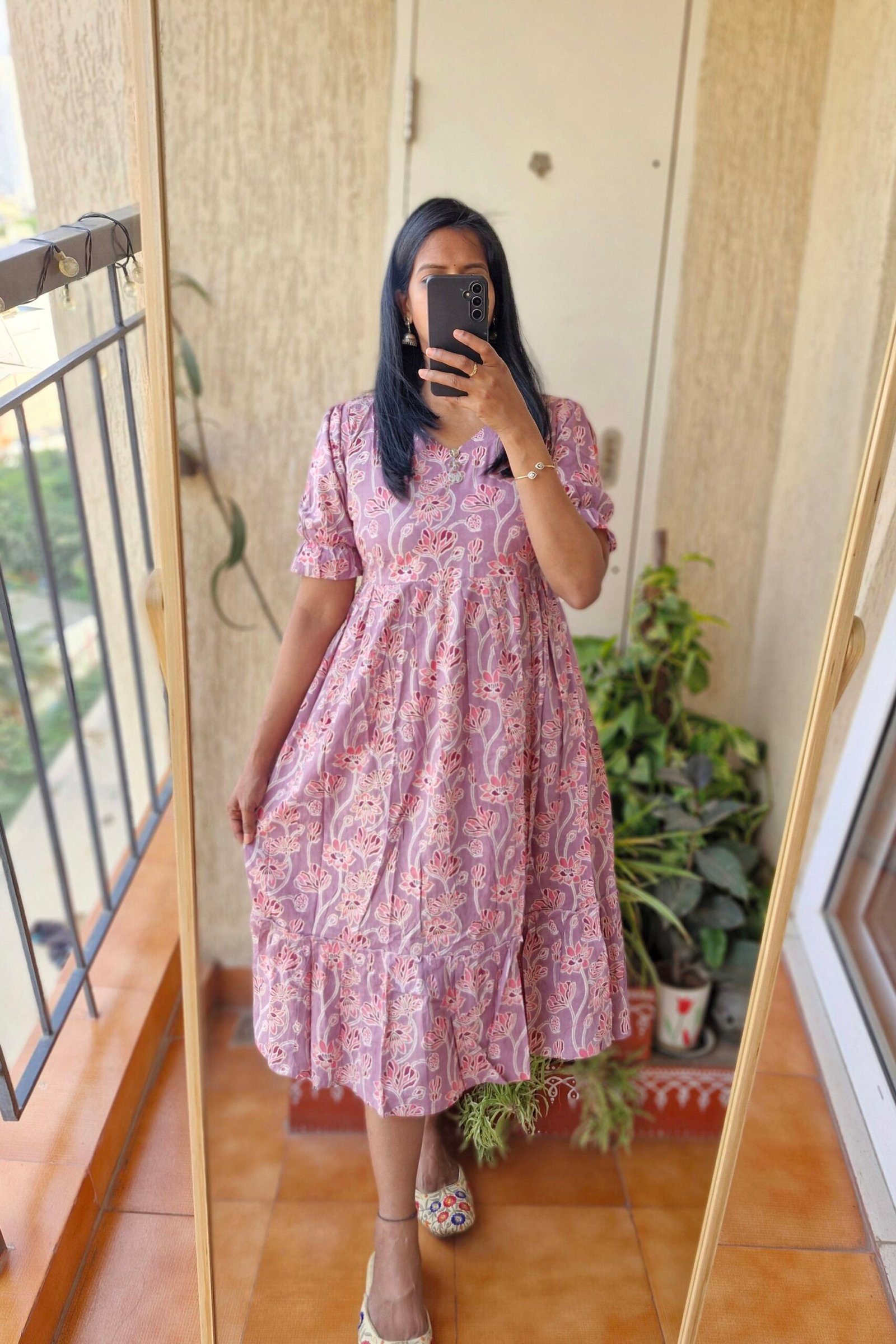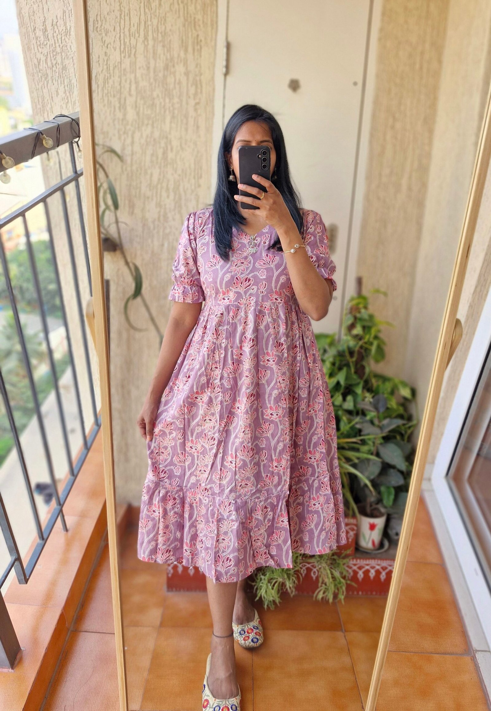 Beautiful Lilac floral Vatican silk dress comes with a detachable pin on yoke part. Length of the dress is – 45 inches. Please choose as per your bust size.