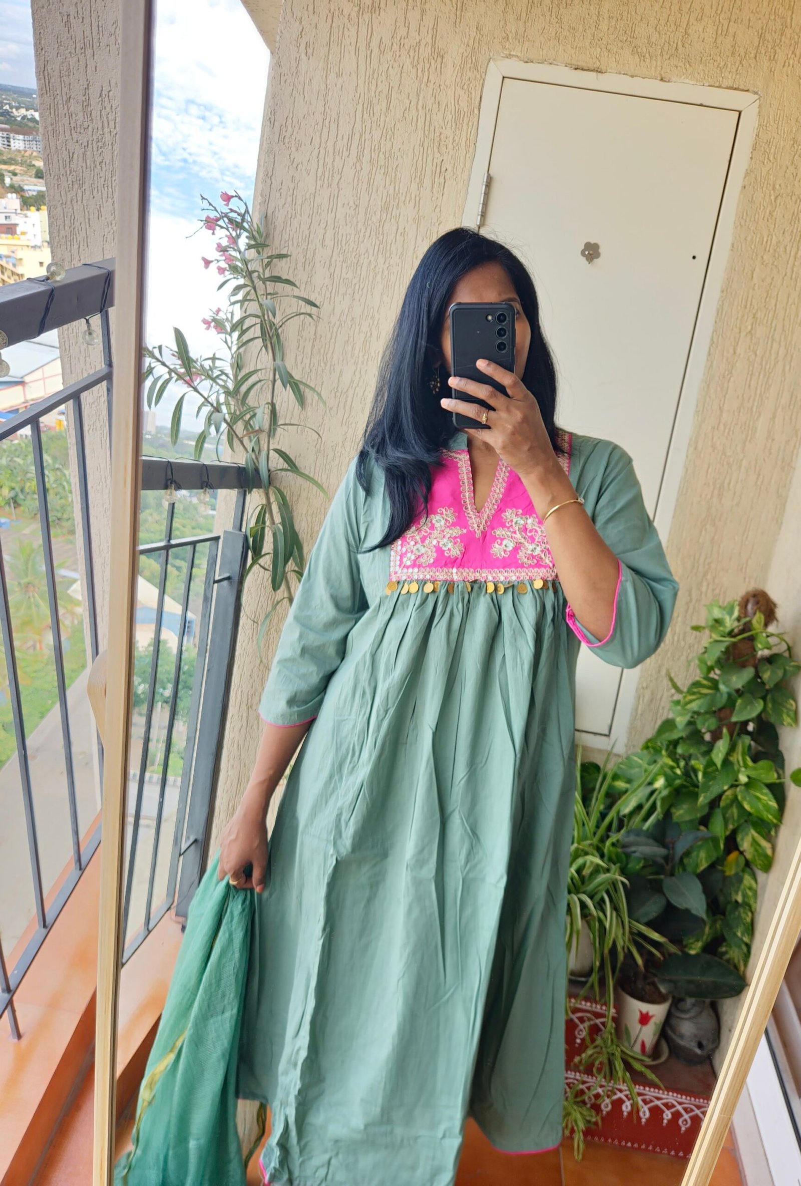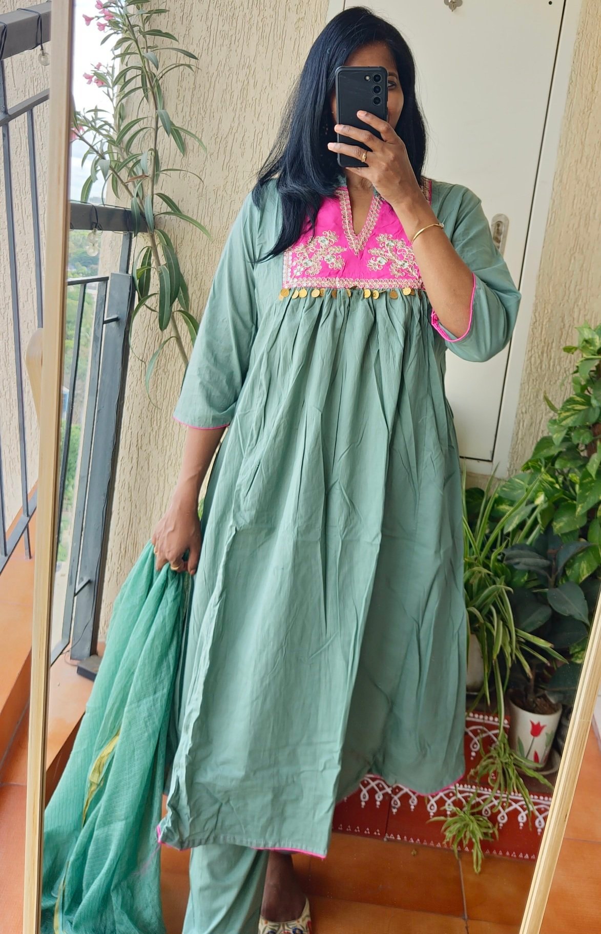 Sea green cotton kurta set .Beautiful coin work on yoke part.Comes with bottom and dhupatta.Length of the dress 46 inches.