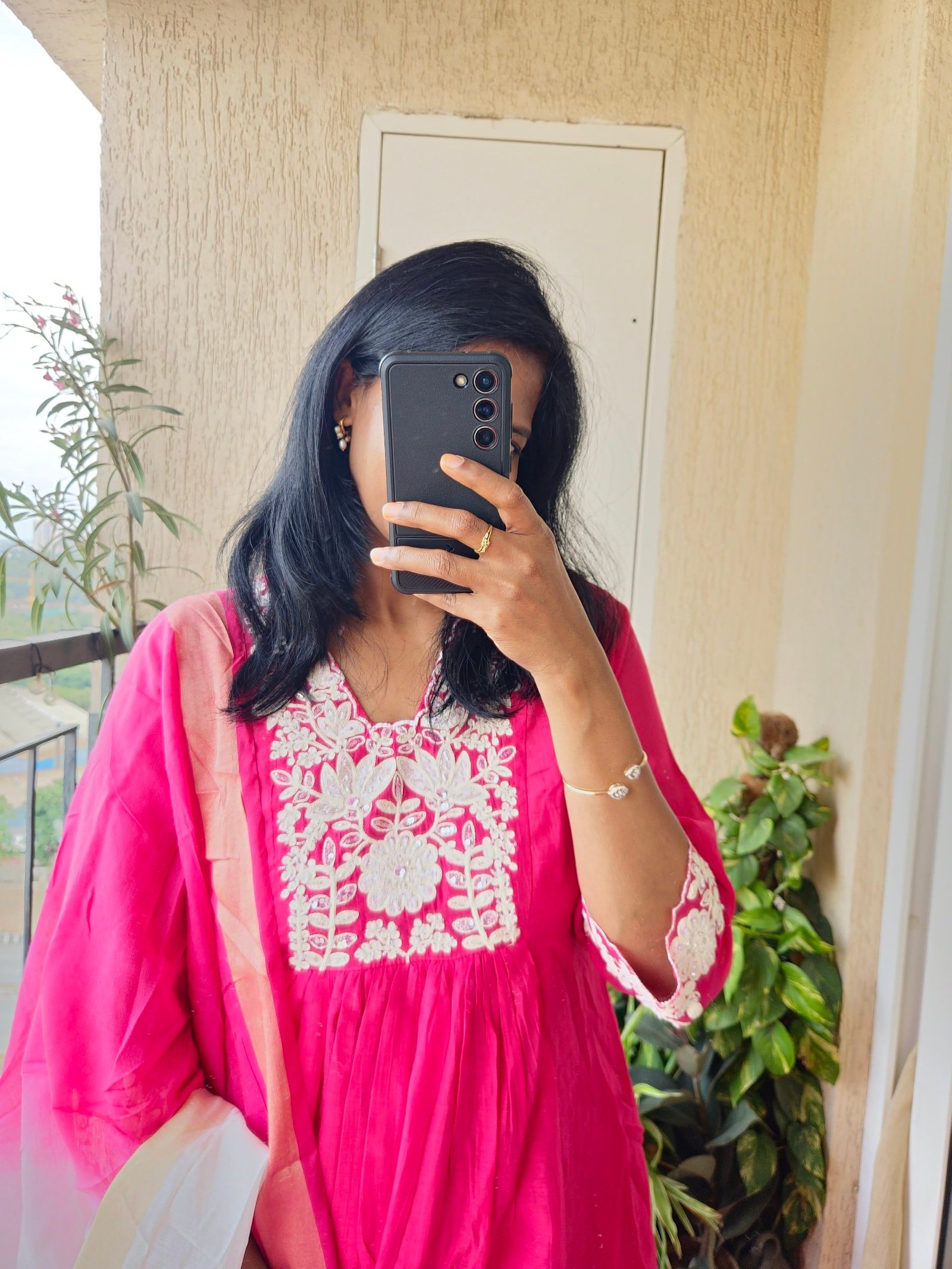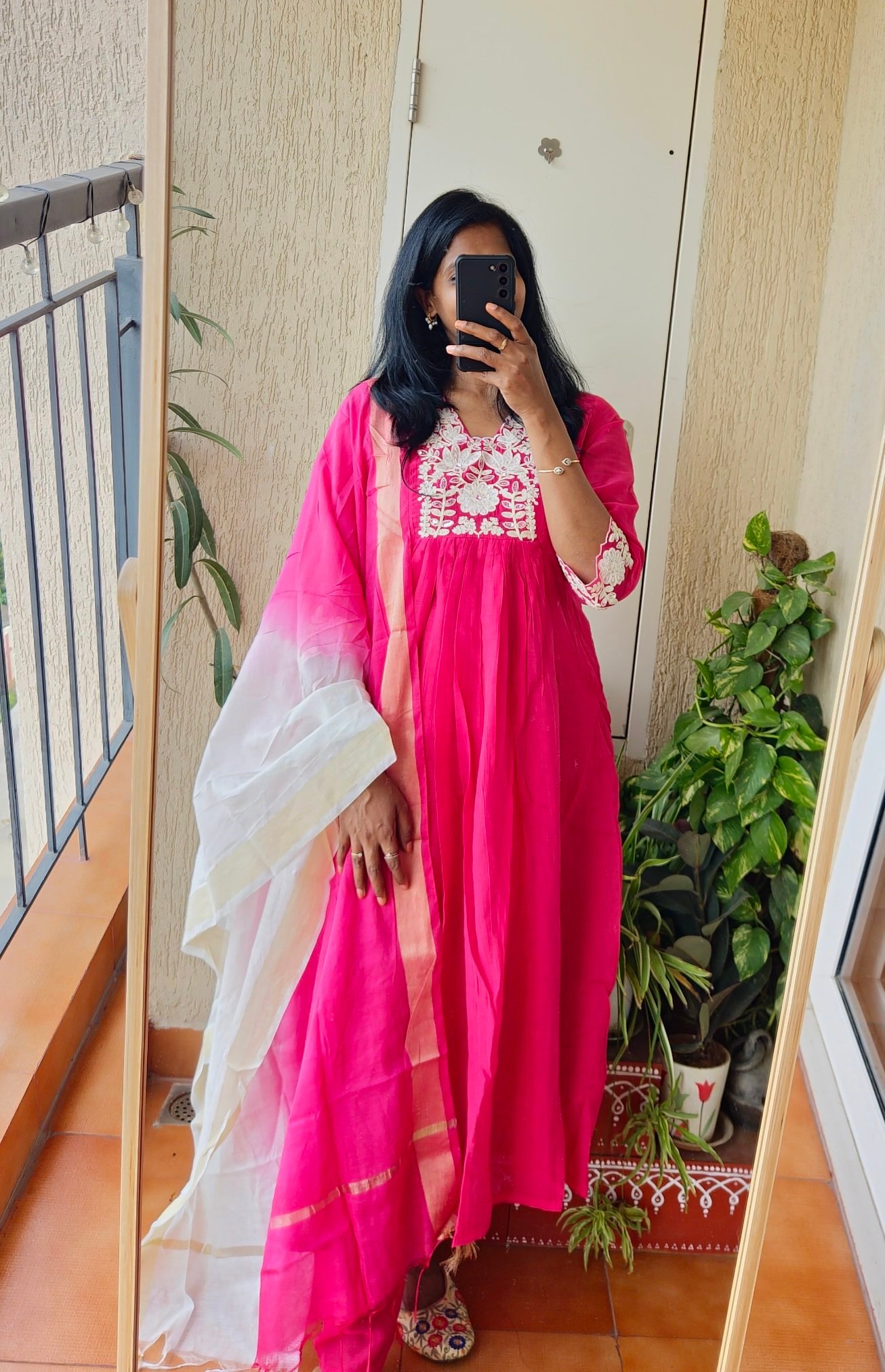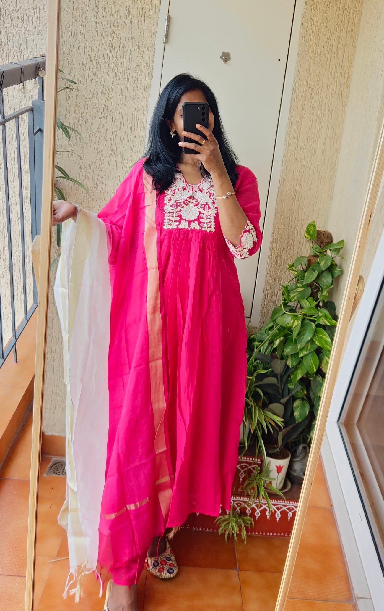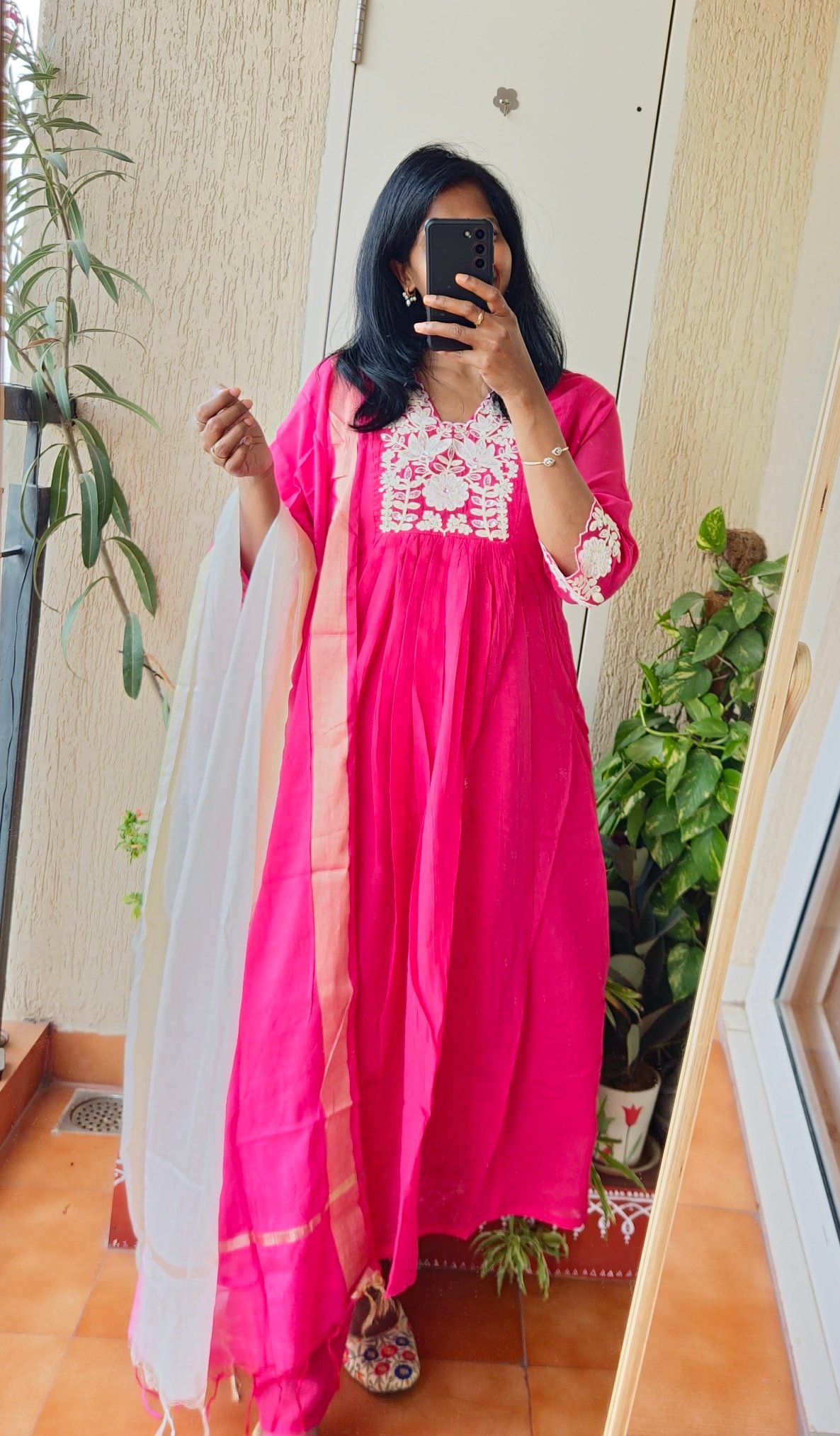 Rani Pink Mul chanderj kurta set. Length of the dress is 46 inches.