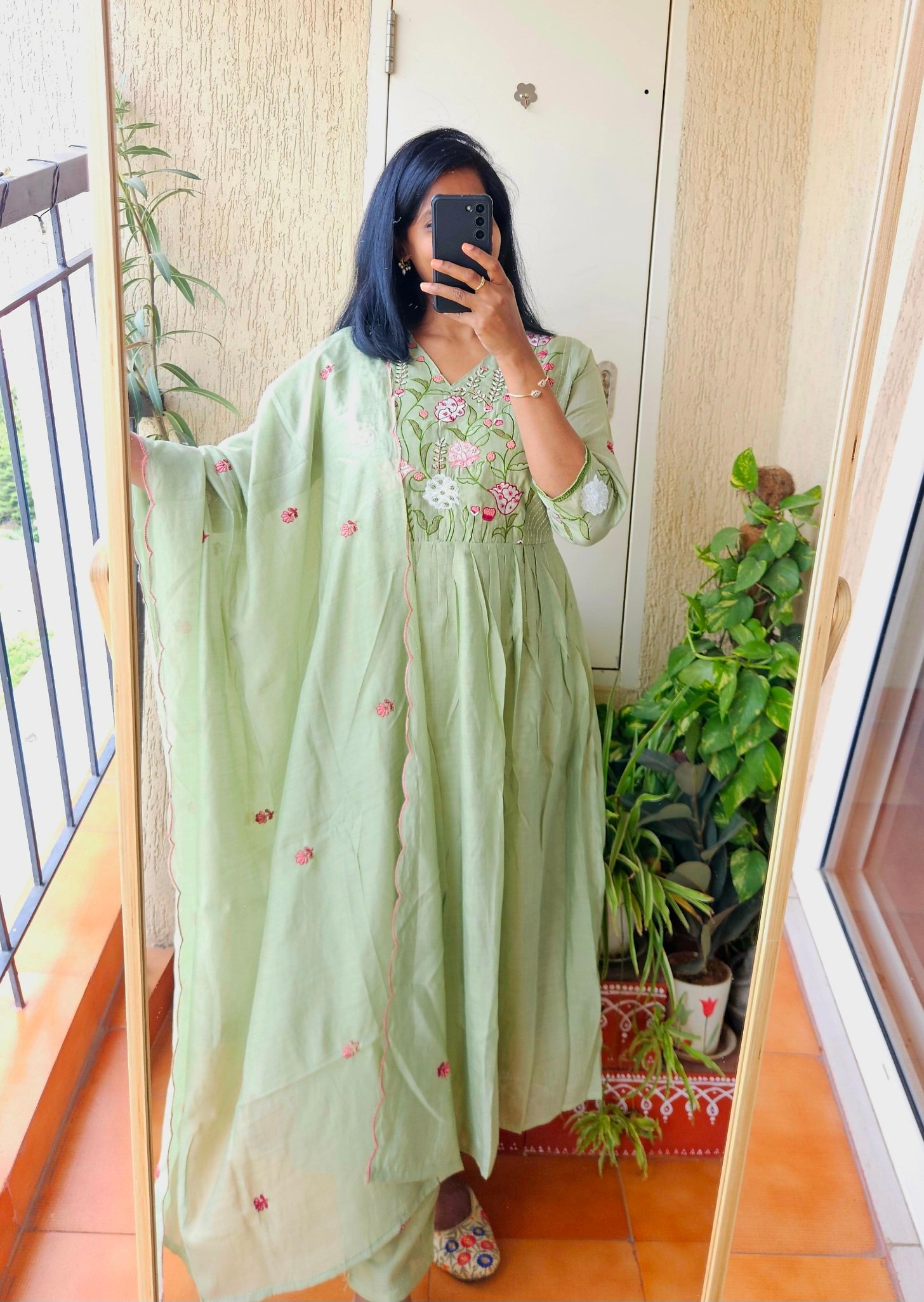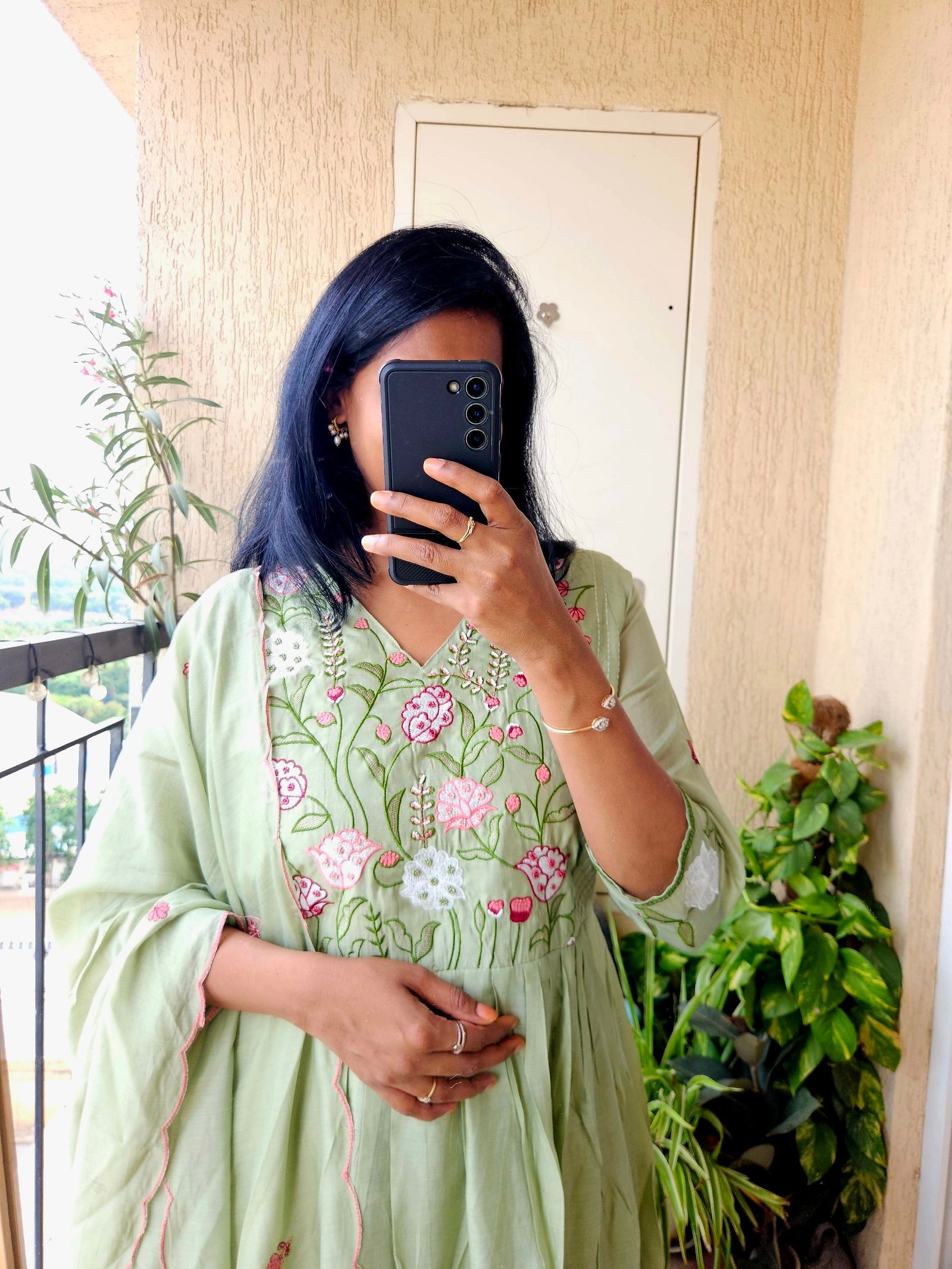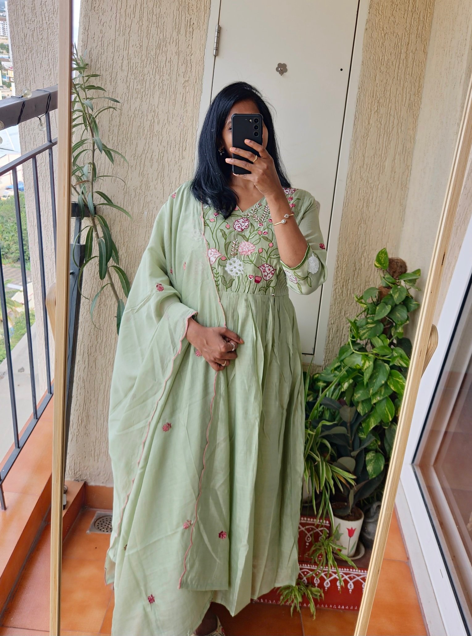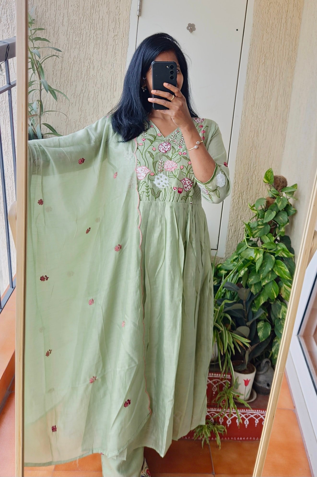 Sage Green Mul chanderi kurta set. Length – 46 inches