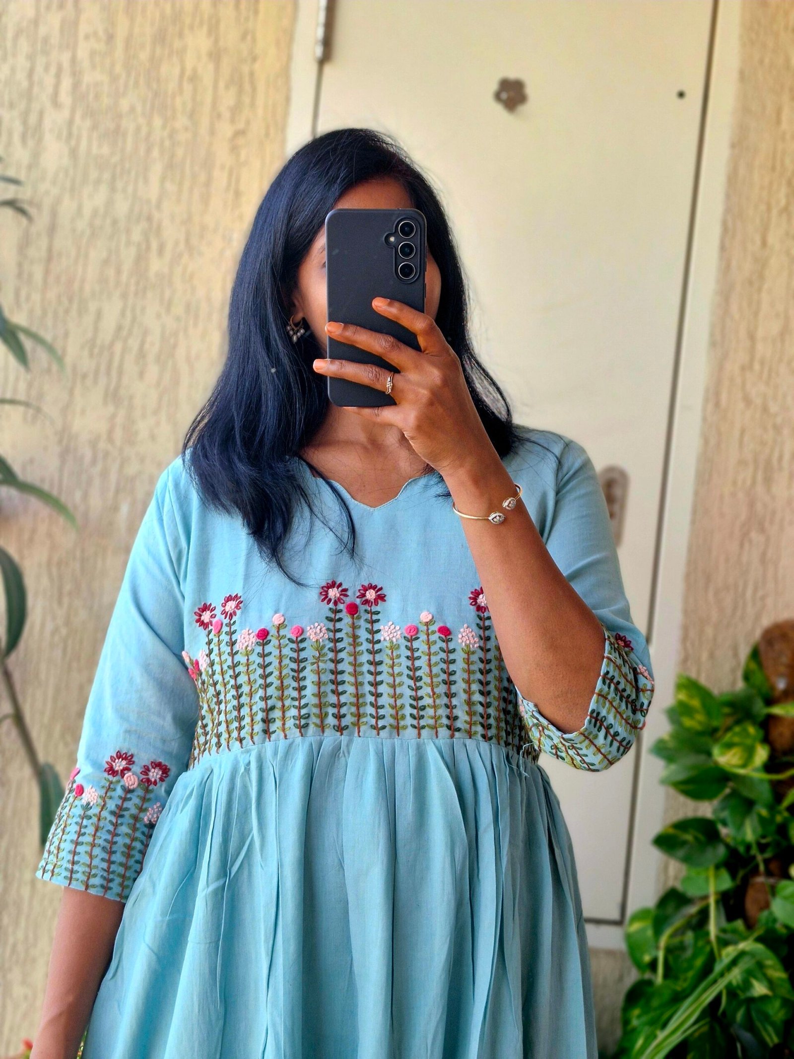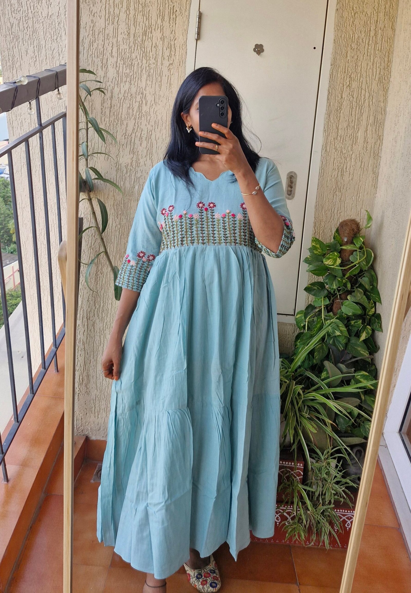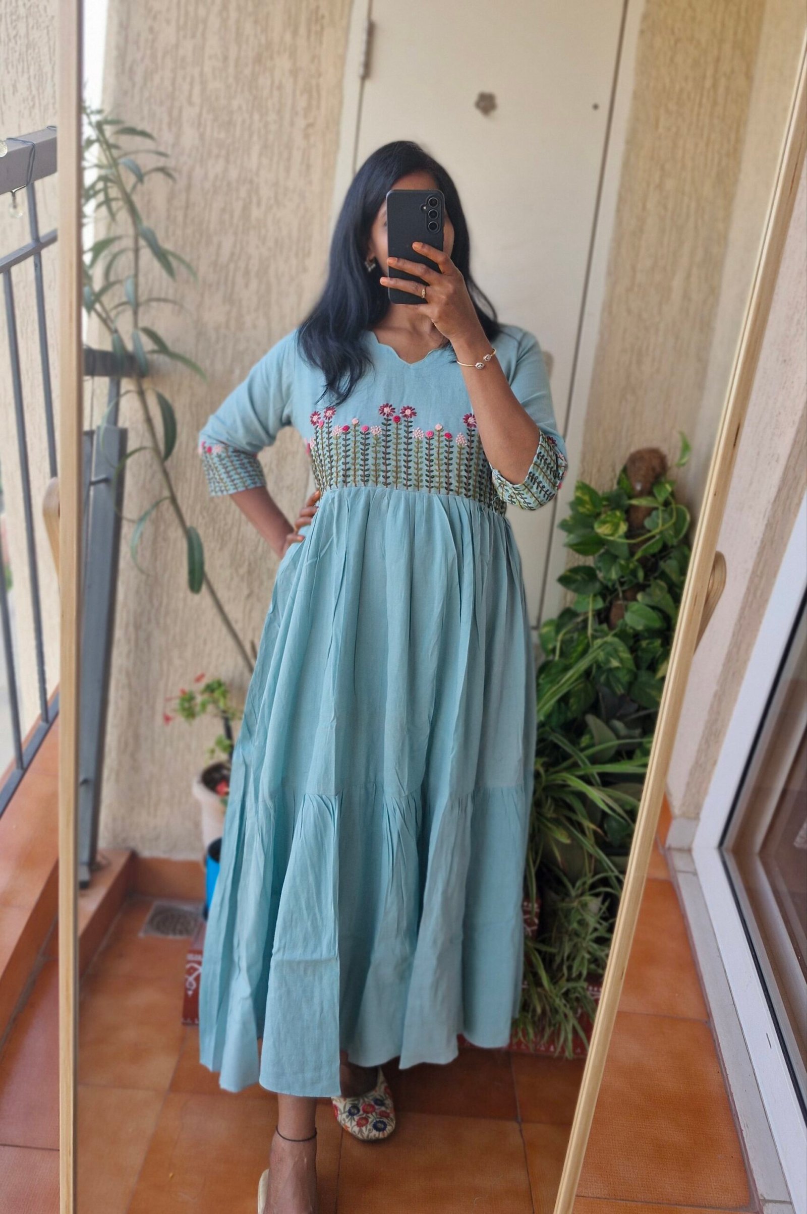 Sea Blue mul cotton dress with a beautiful knot handwork on yoke and sleeves part comes with a three tier and the length of the dress is 49 inches.