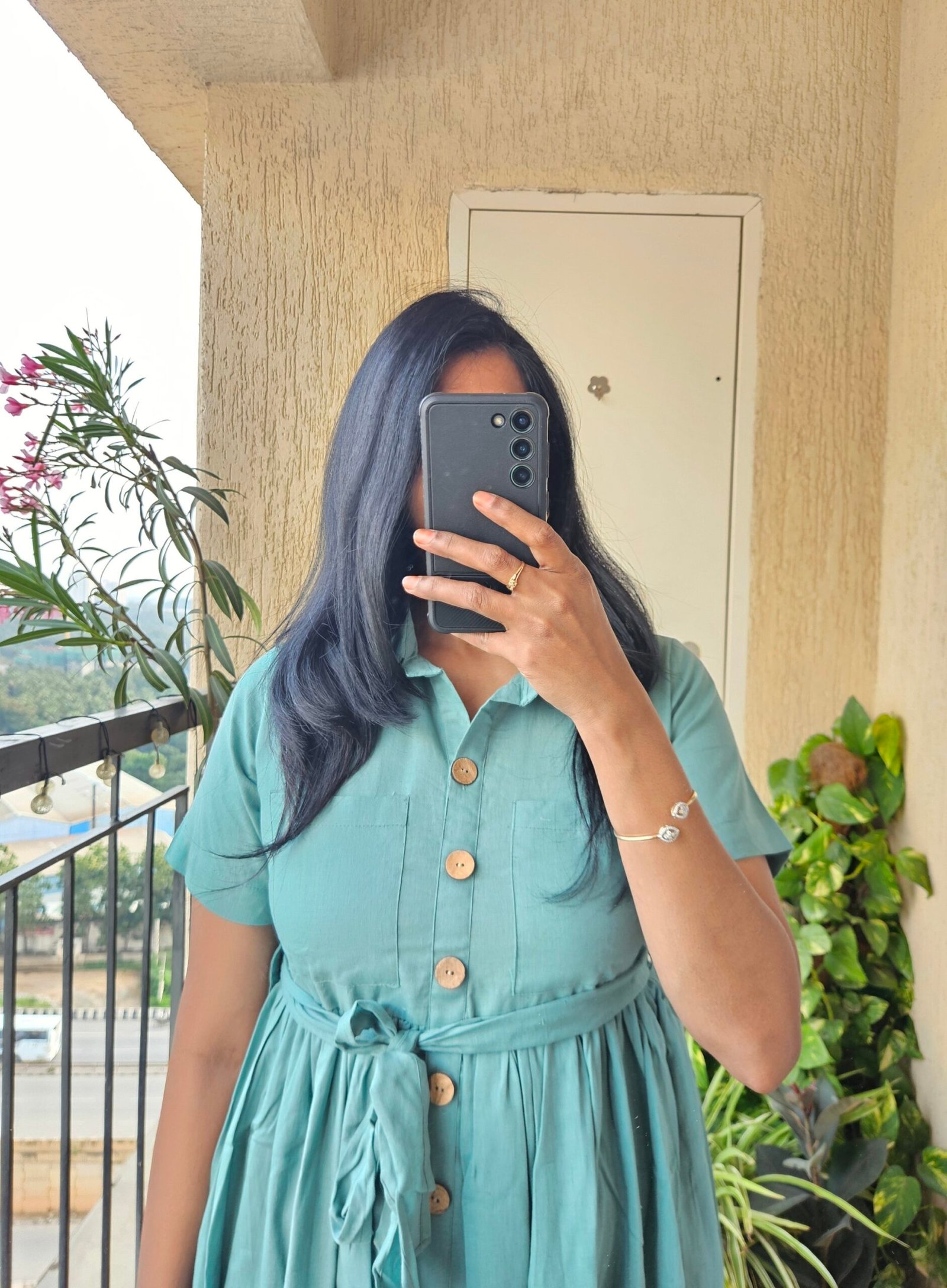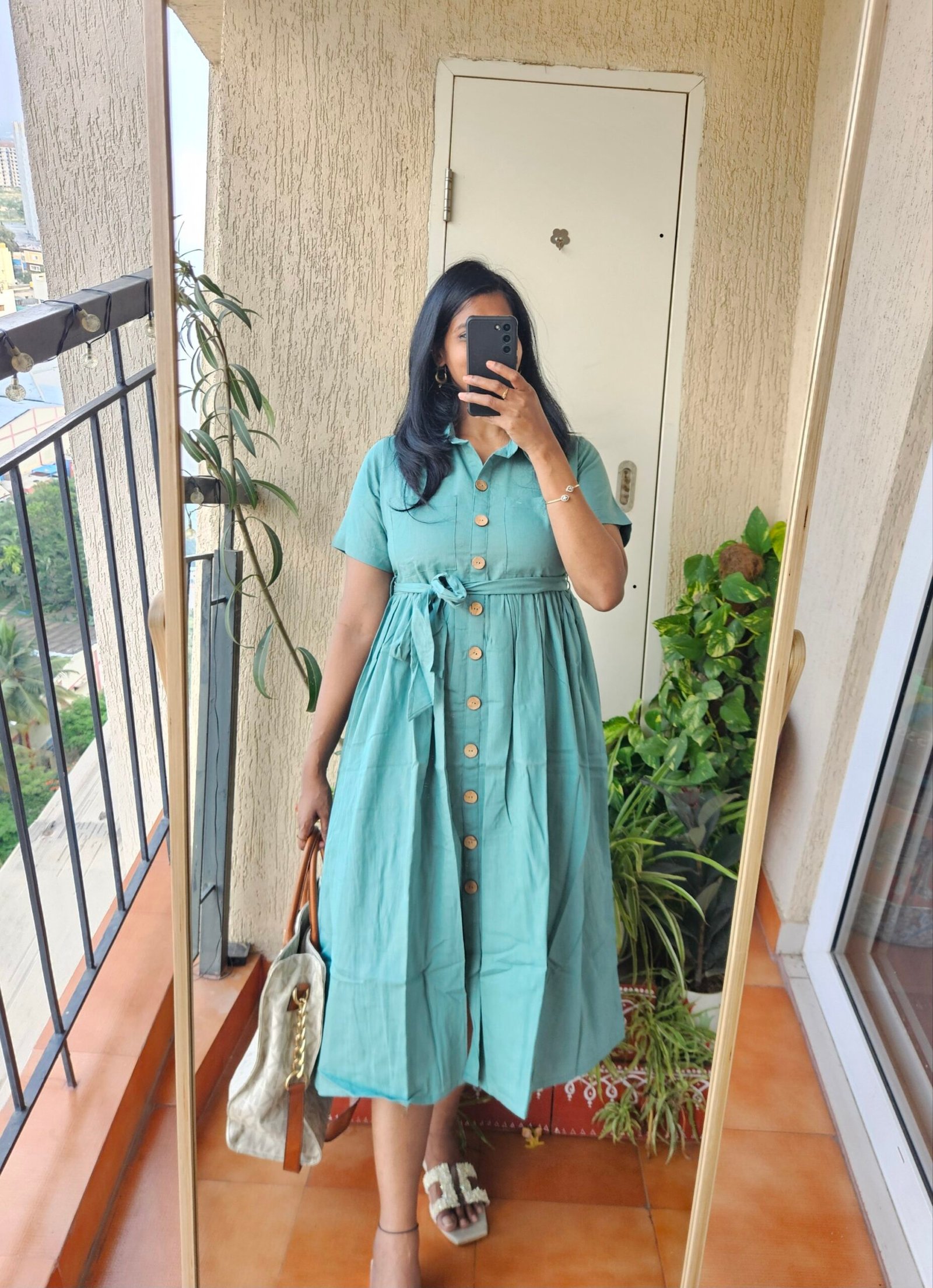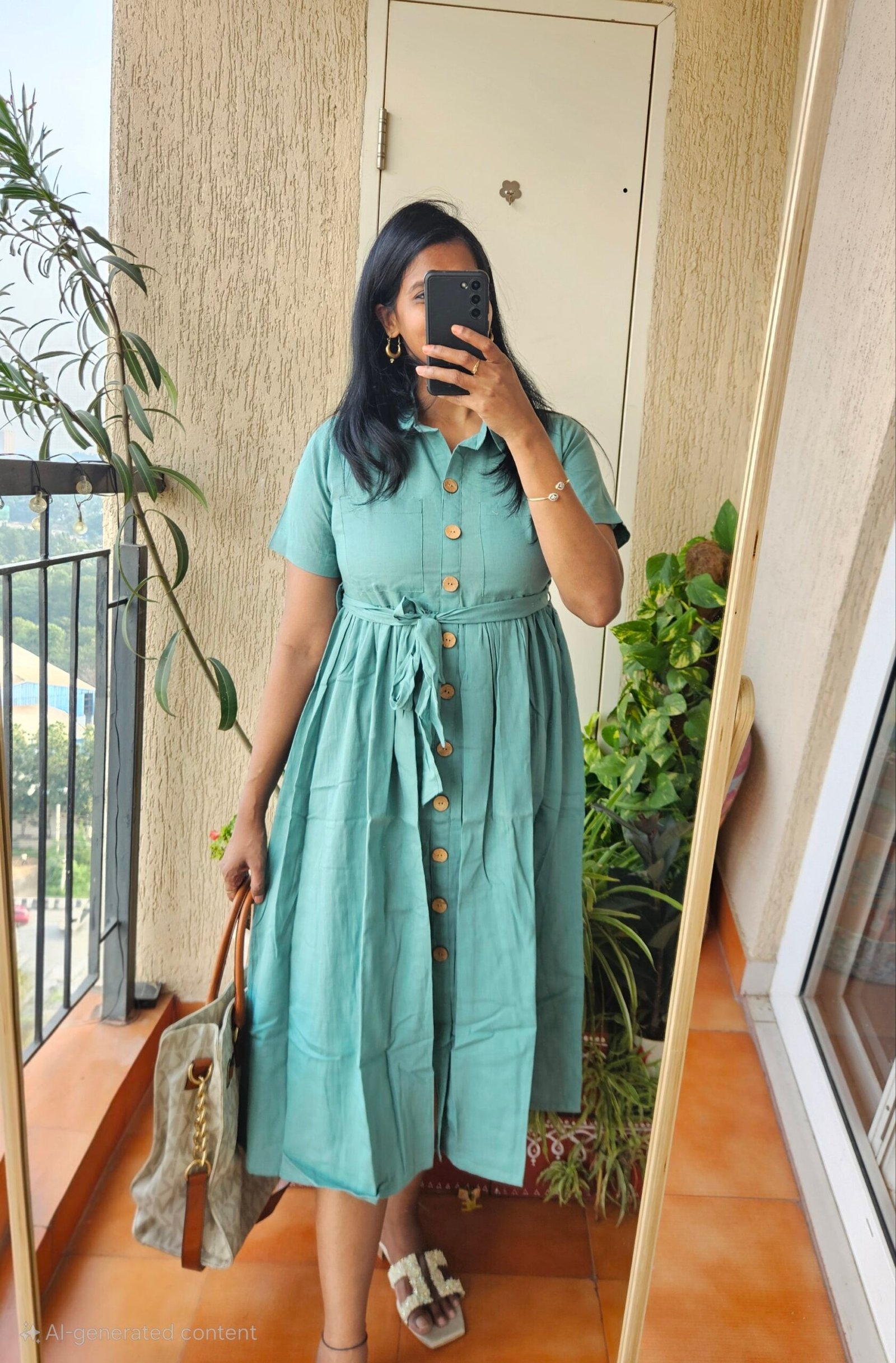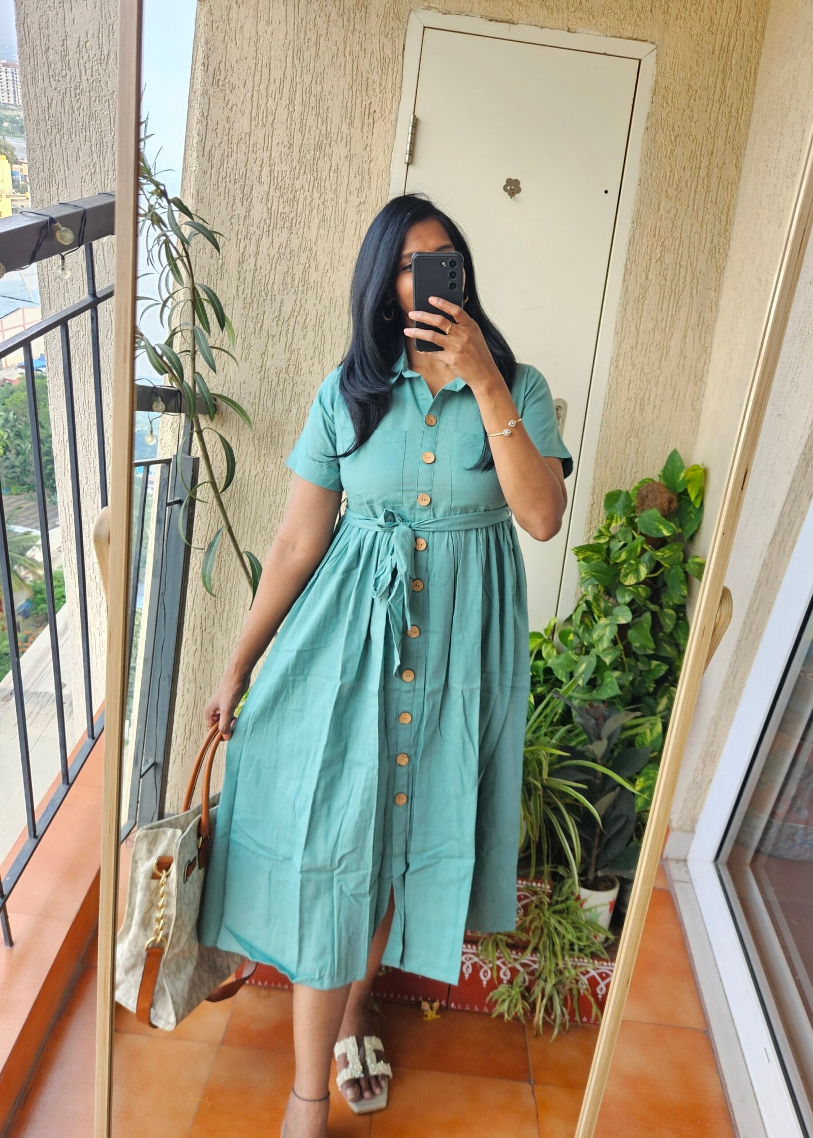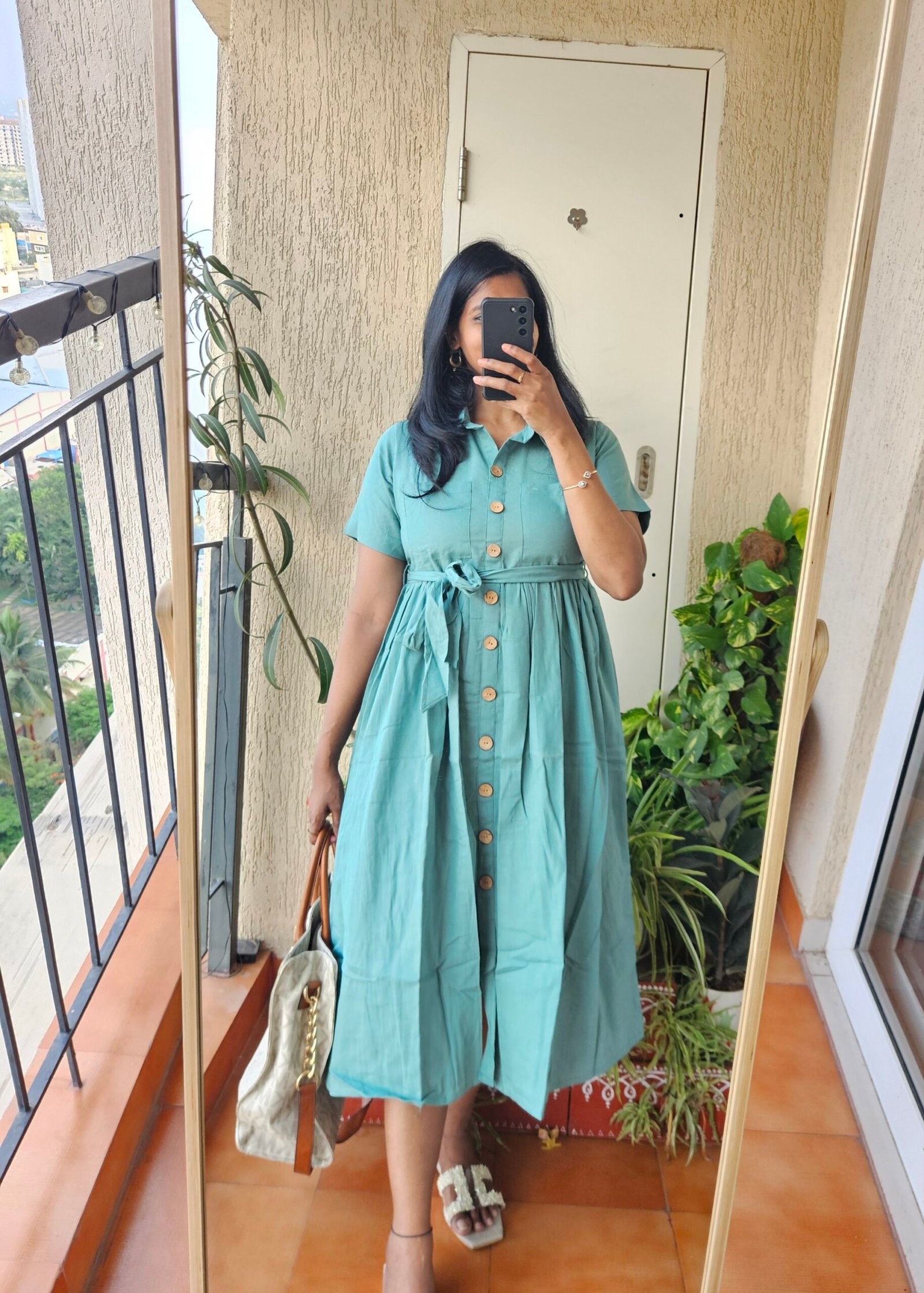 Stunning Sea green solid flex cotton shirt dress comes with a belt and the length of the dress is 44 inches. This dress runs exact to the size if you are exact 38 go for next size if you are less than 38 you can choose 38.