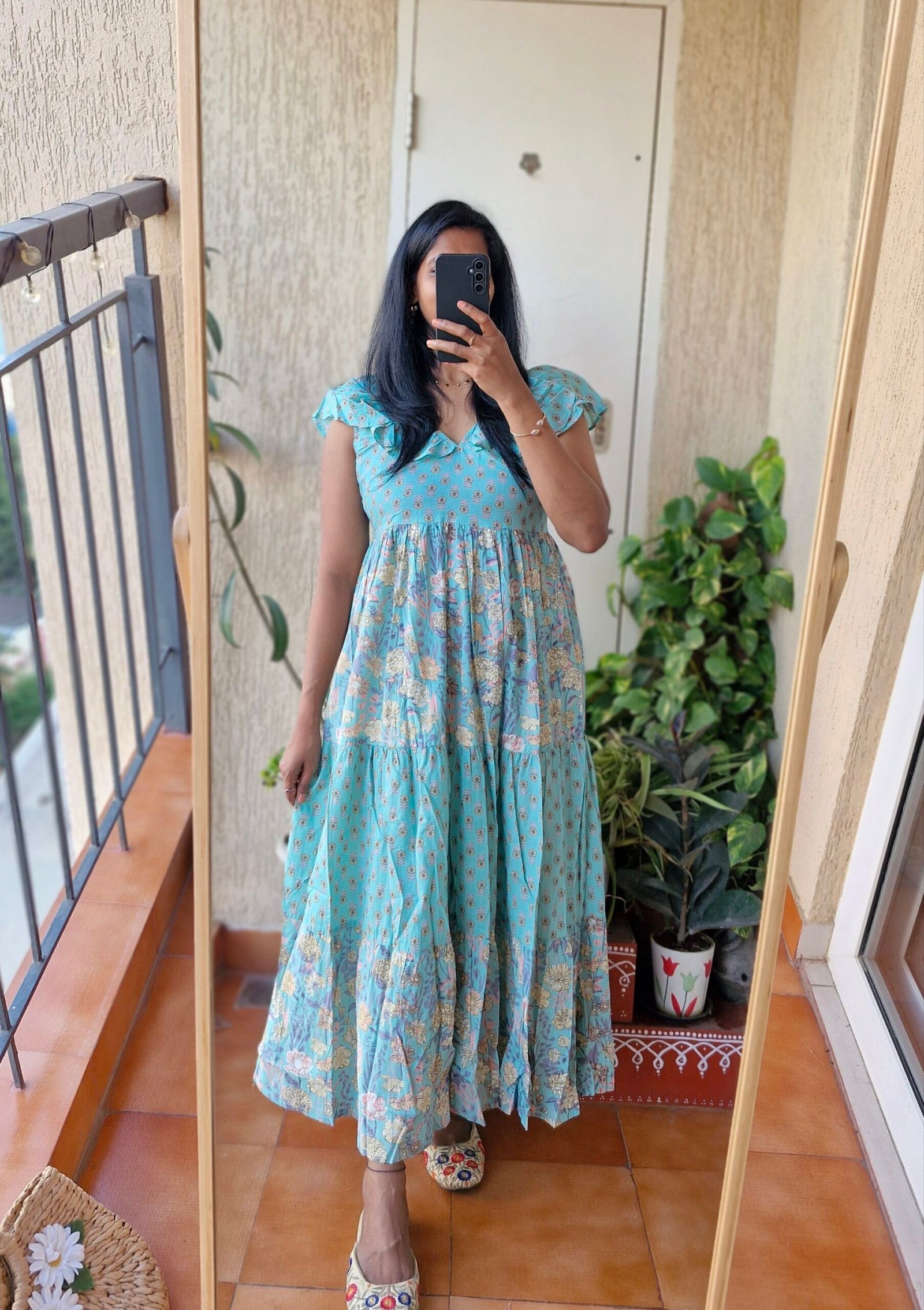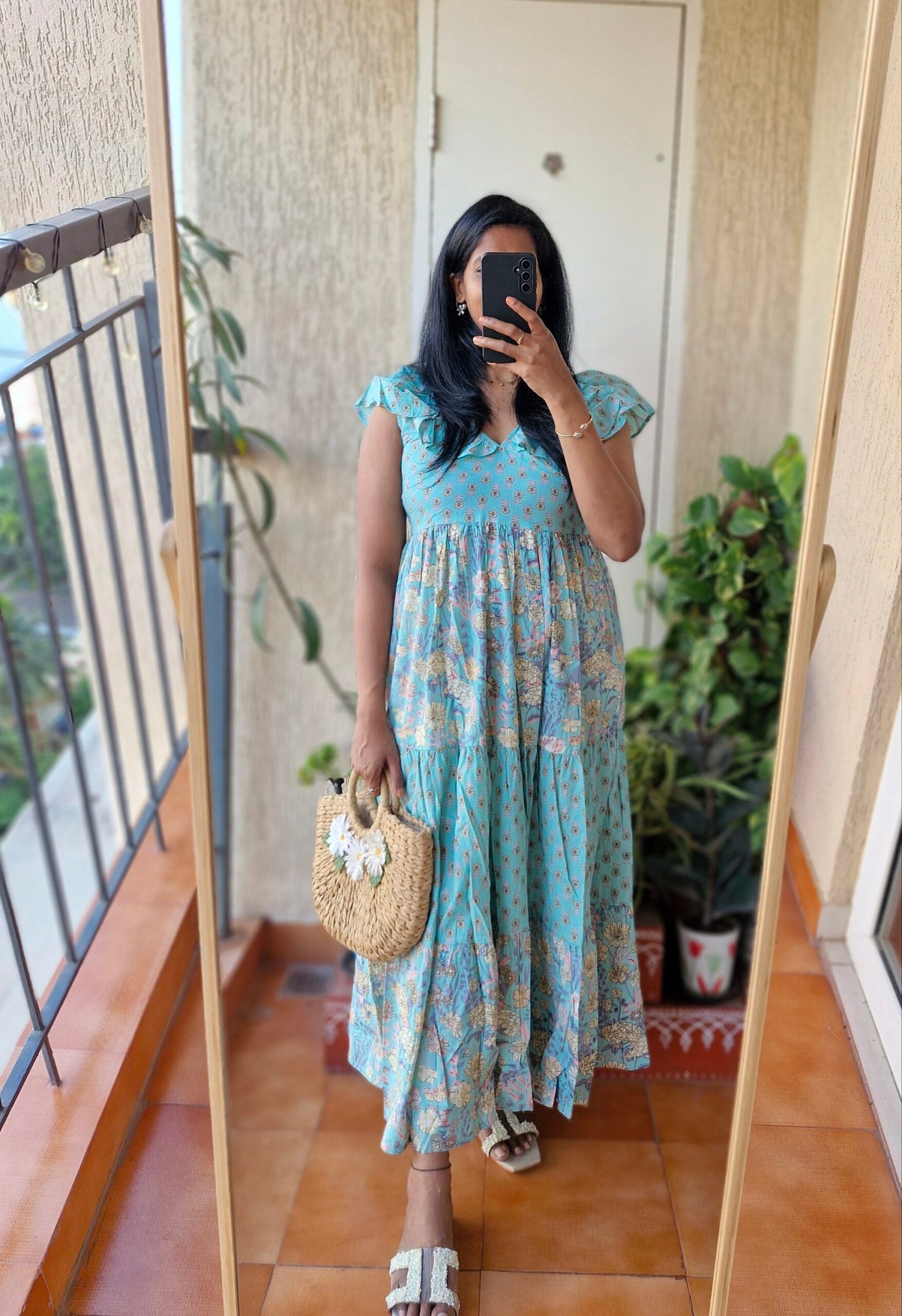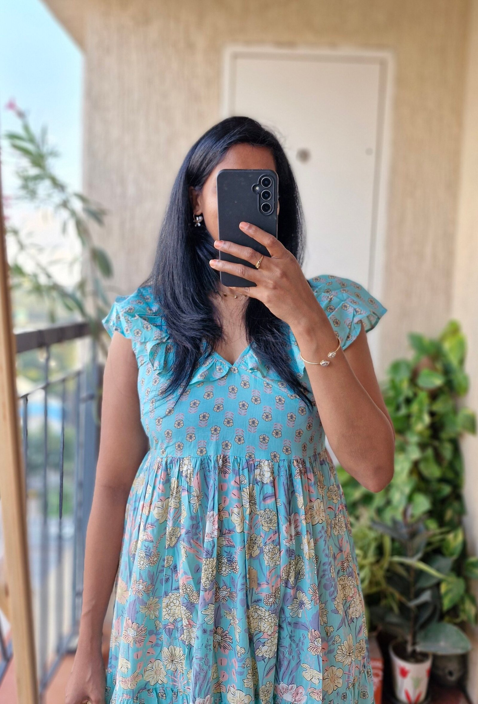 Beautiful sky blue floral cotton dress perfect go to vacay/brunch dress and at a super budget friendly price. Comes with a length of 53 inches.