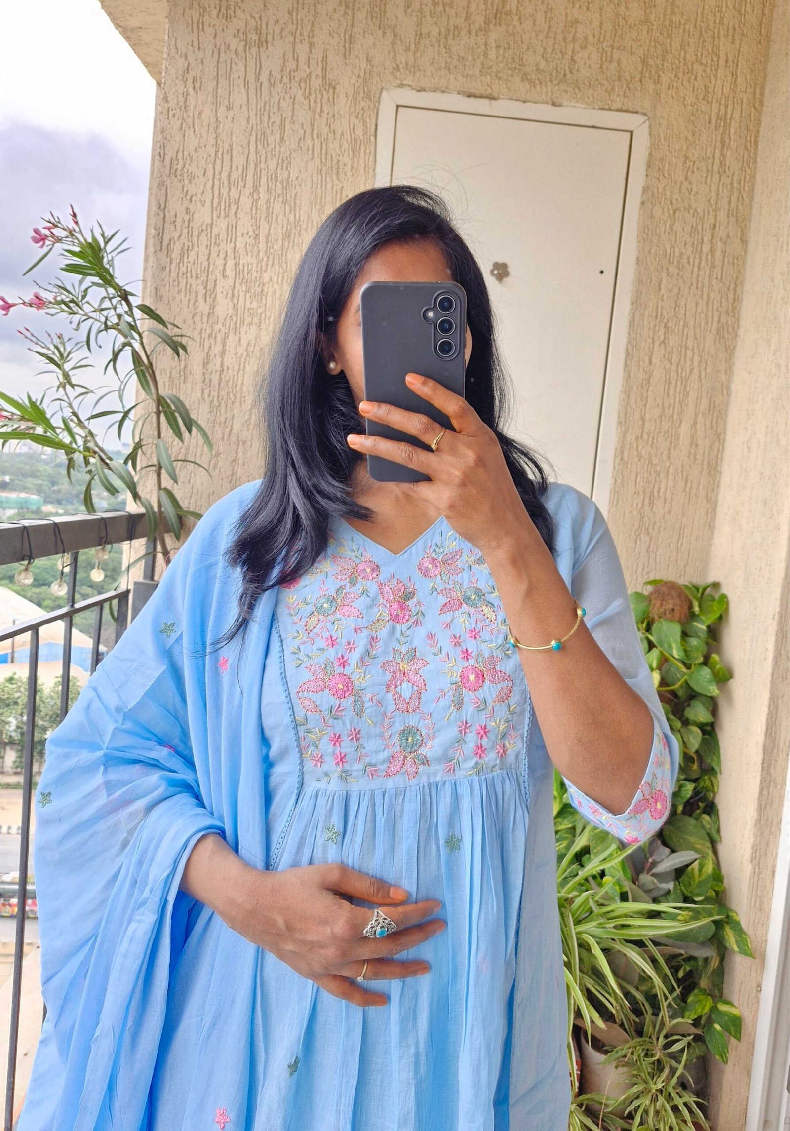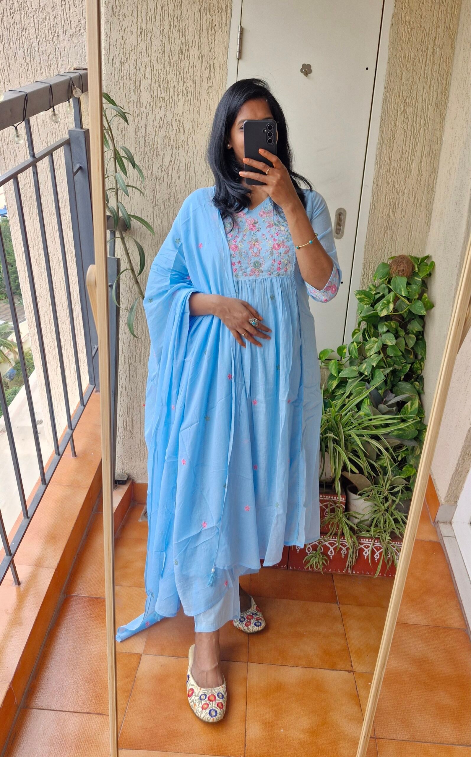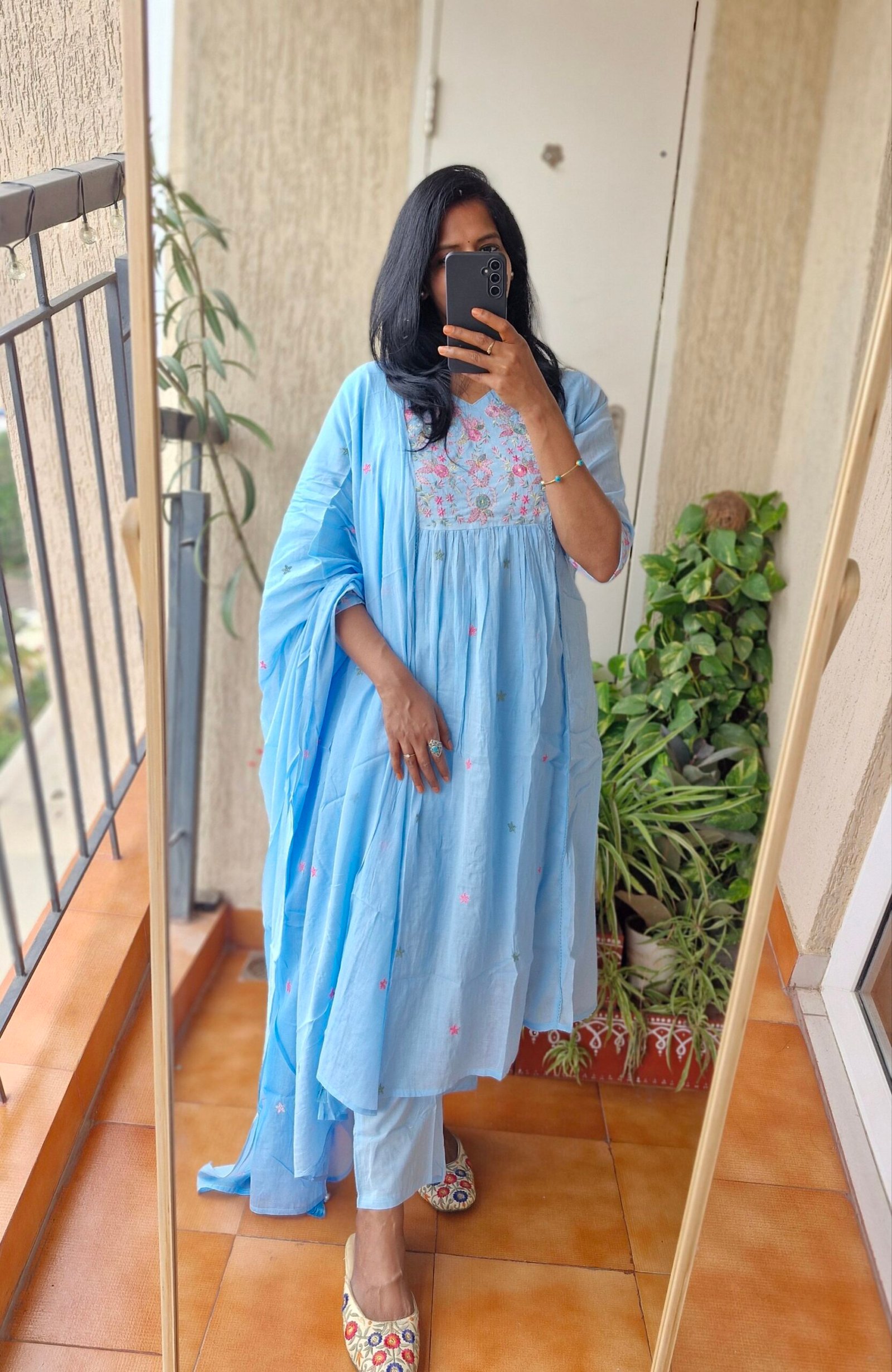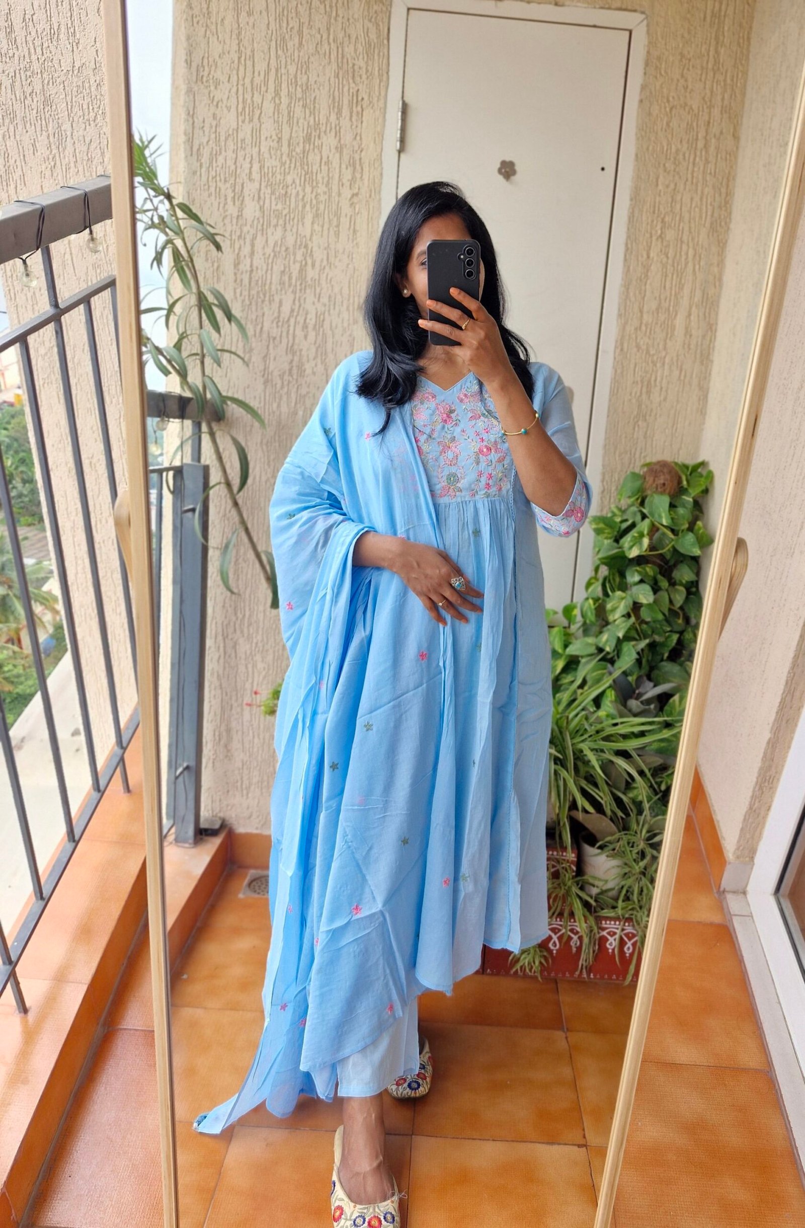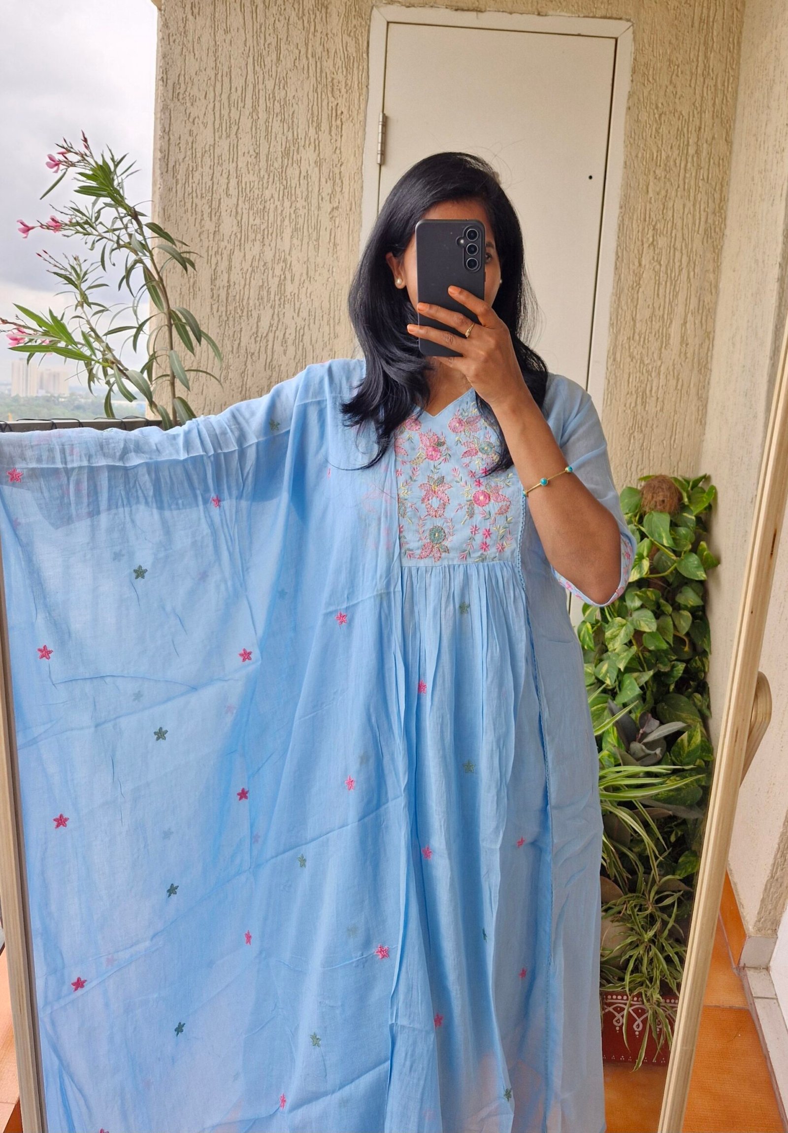 Beautiful sky blue mul cotton kurta set comes with a beautiful embroidery on yoke and sleeves.Absolute stunner and looks so eleganf and comfortable.Length of the dress is 46 inches.