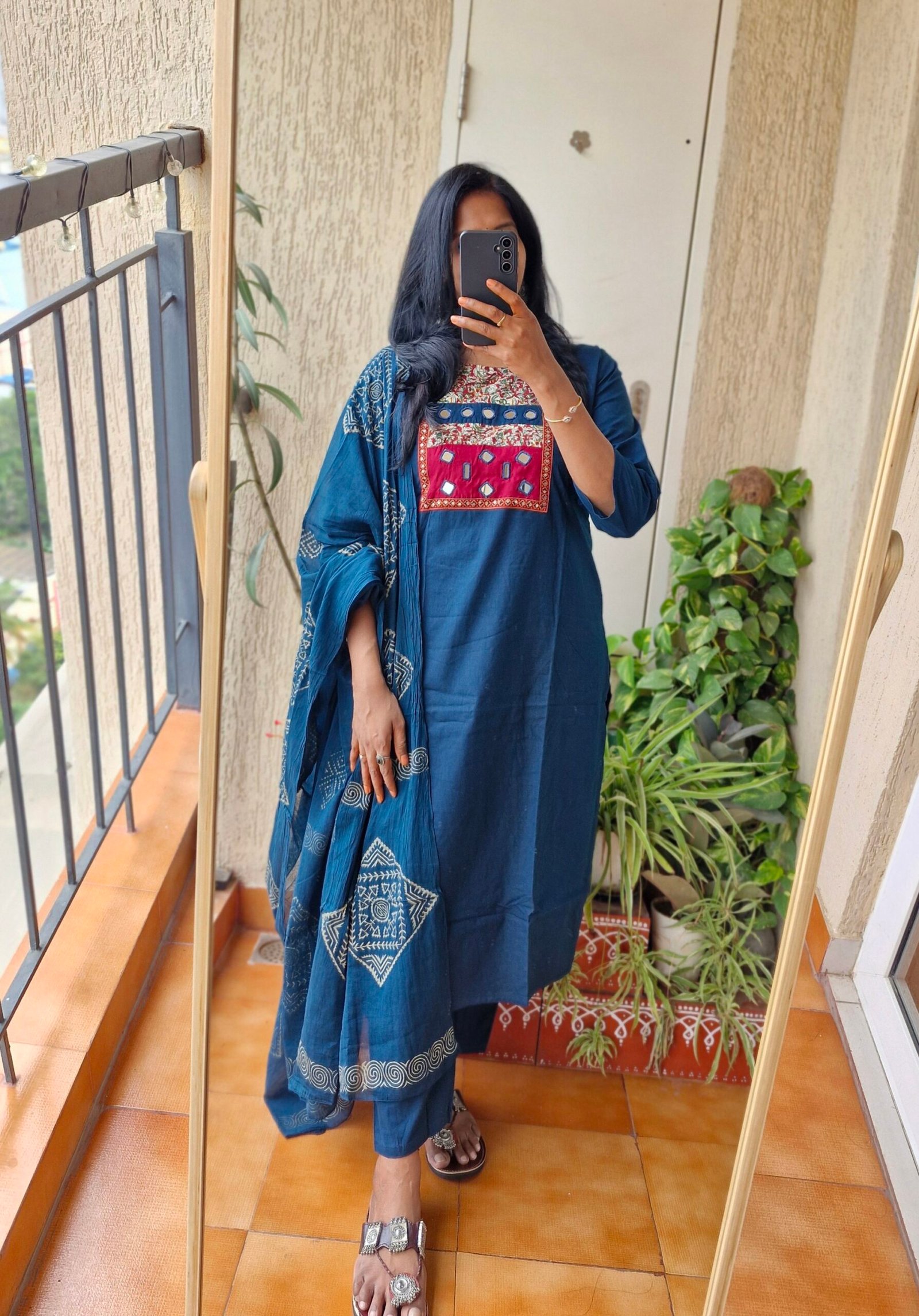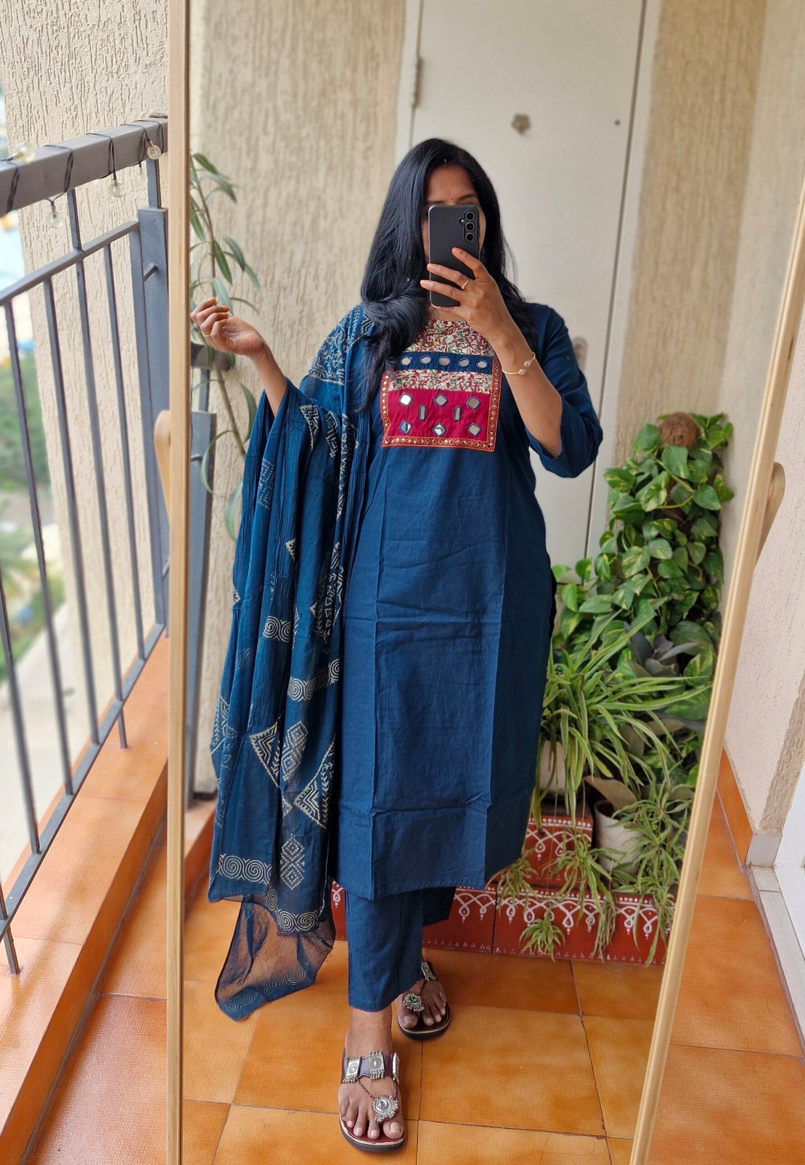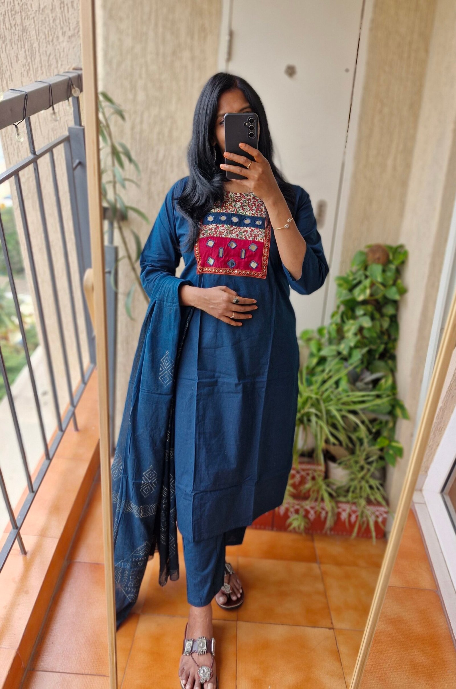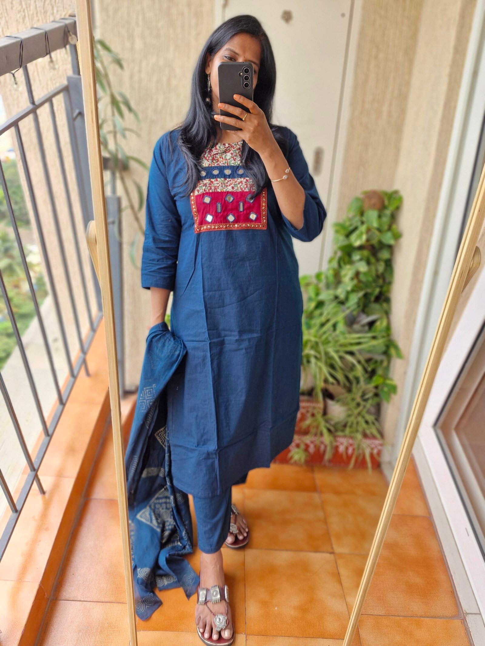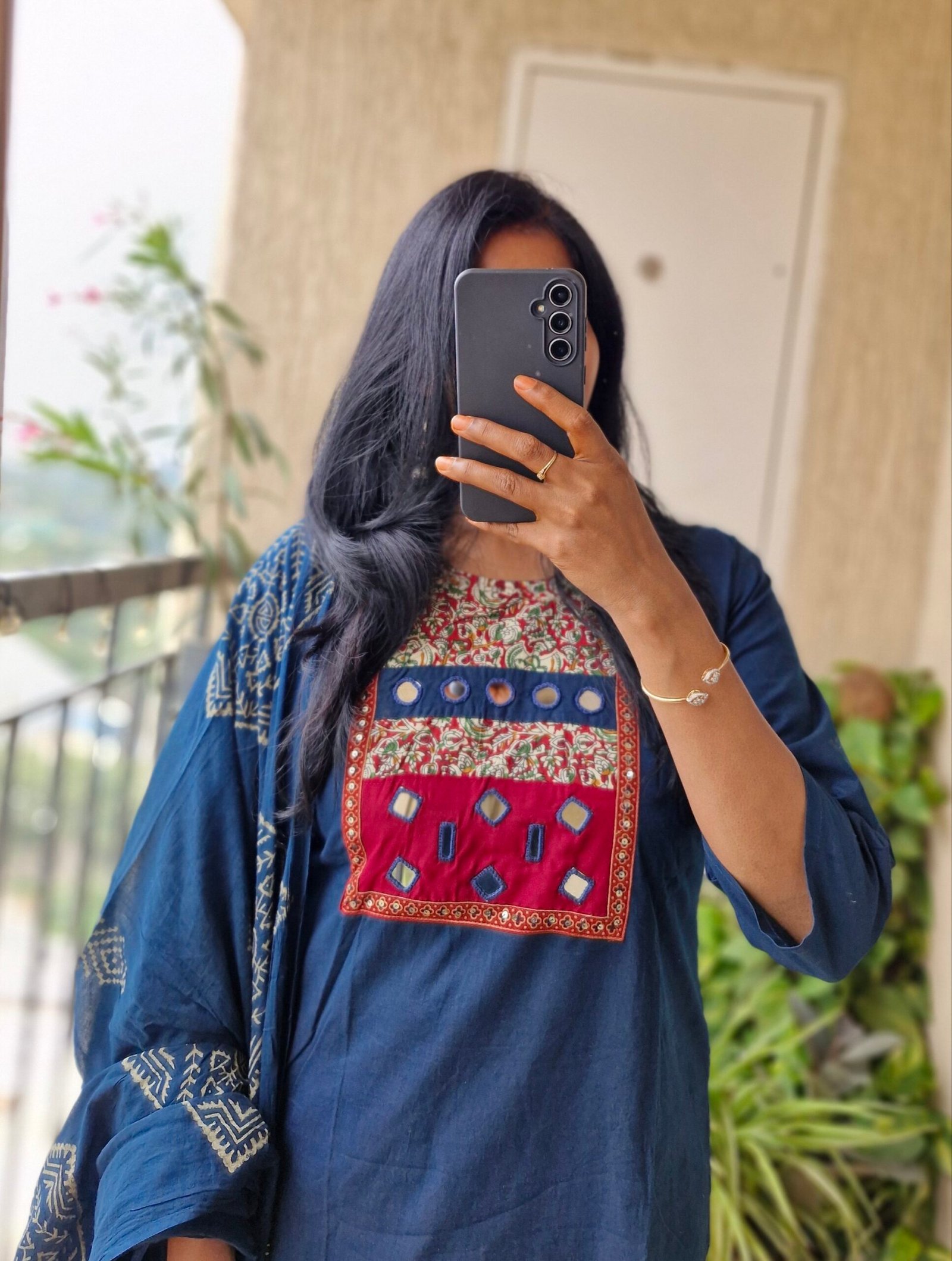 Teal blue handloom cotton dress comes with a beautiful kalamkari and mirror applique work om yoke part.Length of the dress is 44 inches.