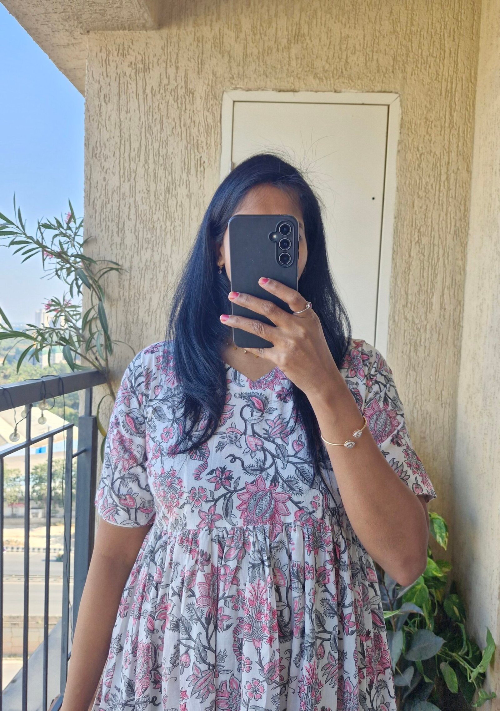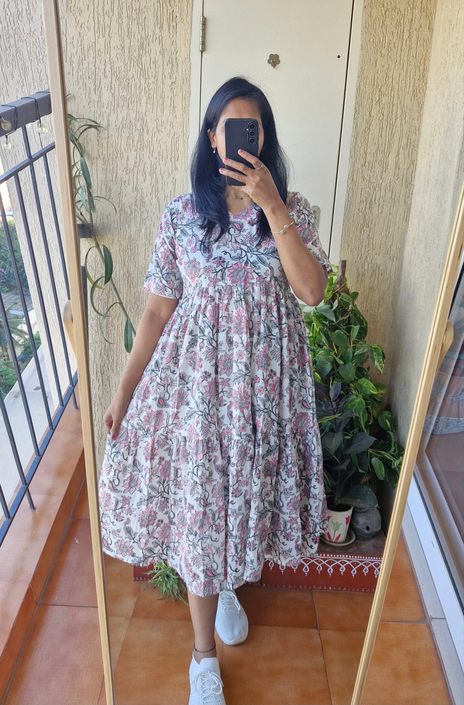Beautiful white floral bagru block print cotton dress comes with the length of 46 inches with a good flare.Choose exact to your bust size as it has extra half inch margins on both sides.