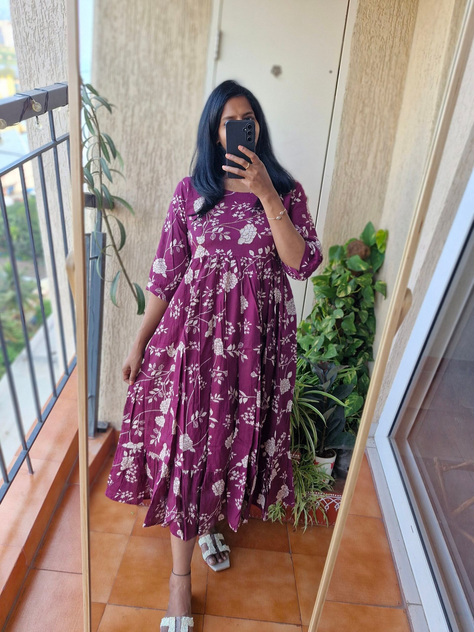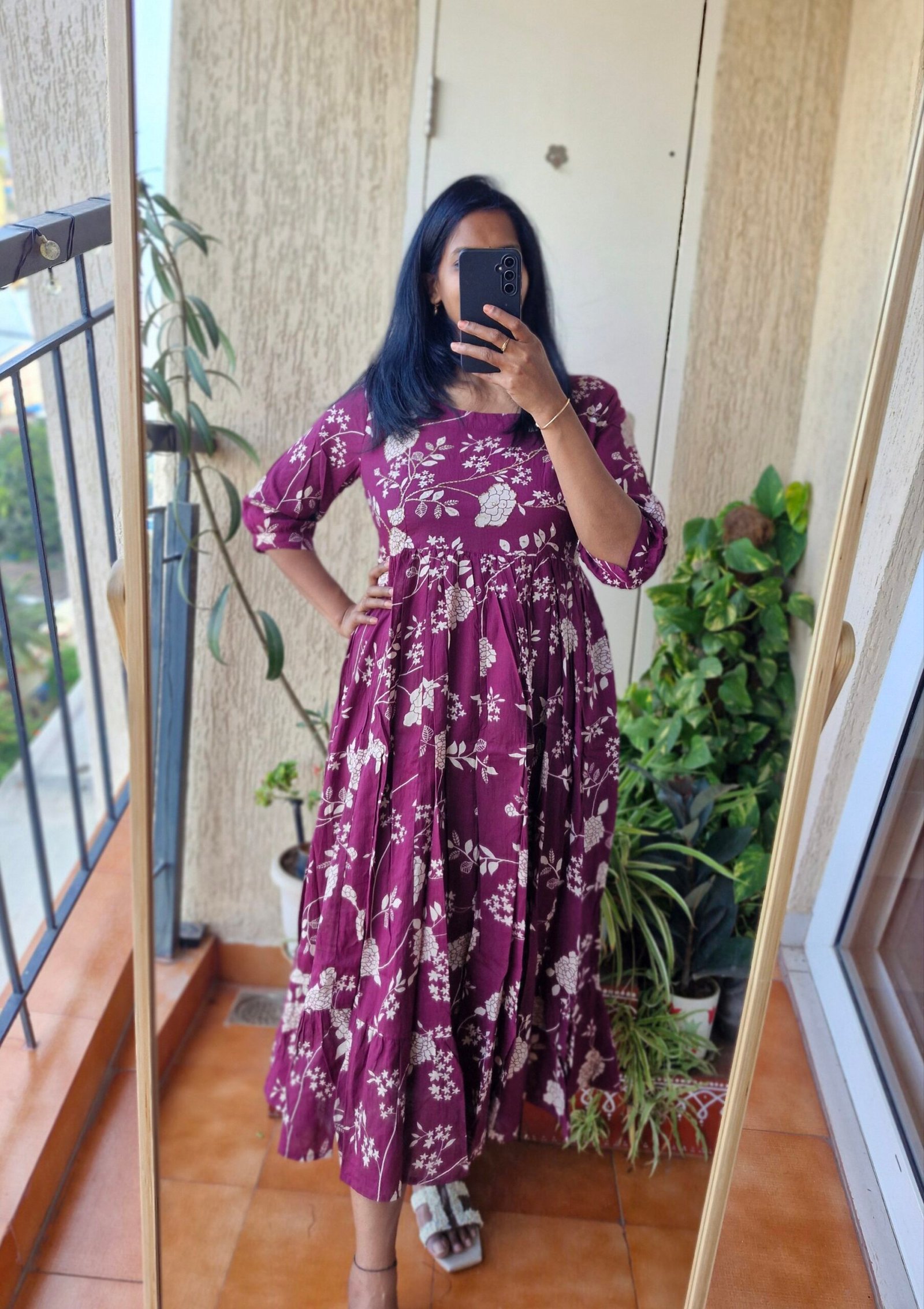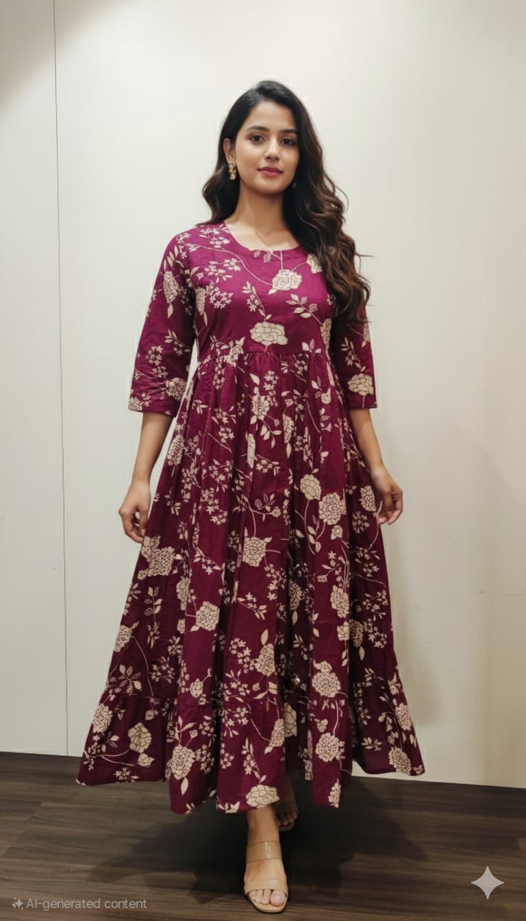 Beautiful wine color mul cotton dress comes with a katha sequence work on yoke part super comfortable and soft comes with the length 46 inches.Comes with a pocket.