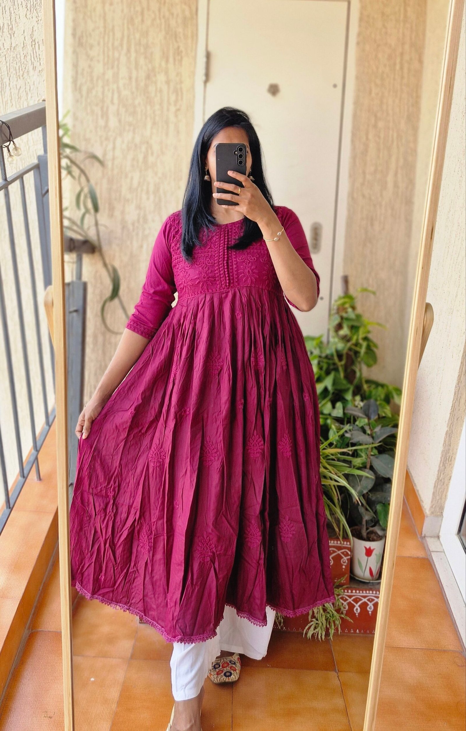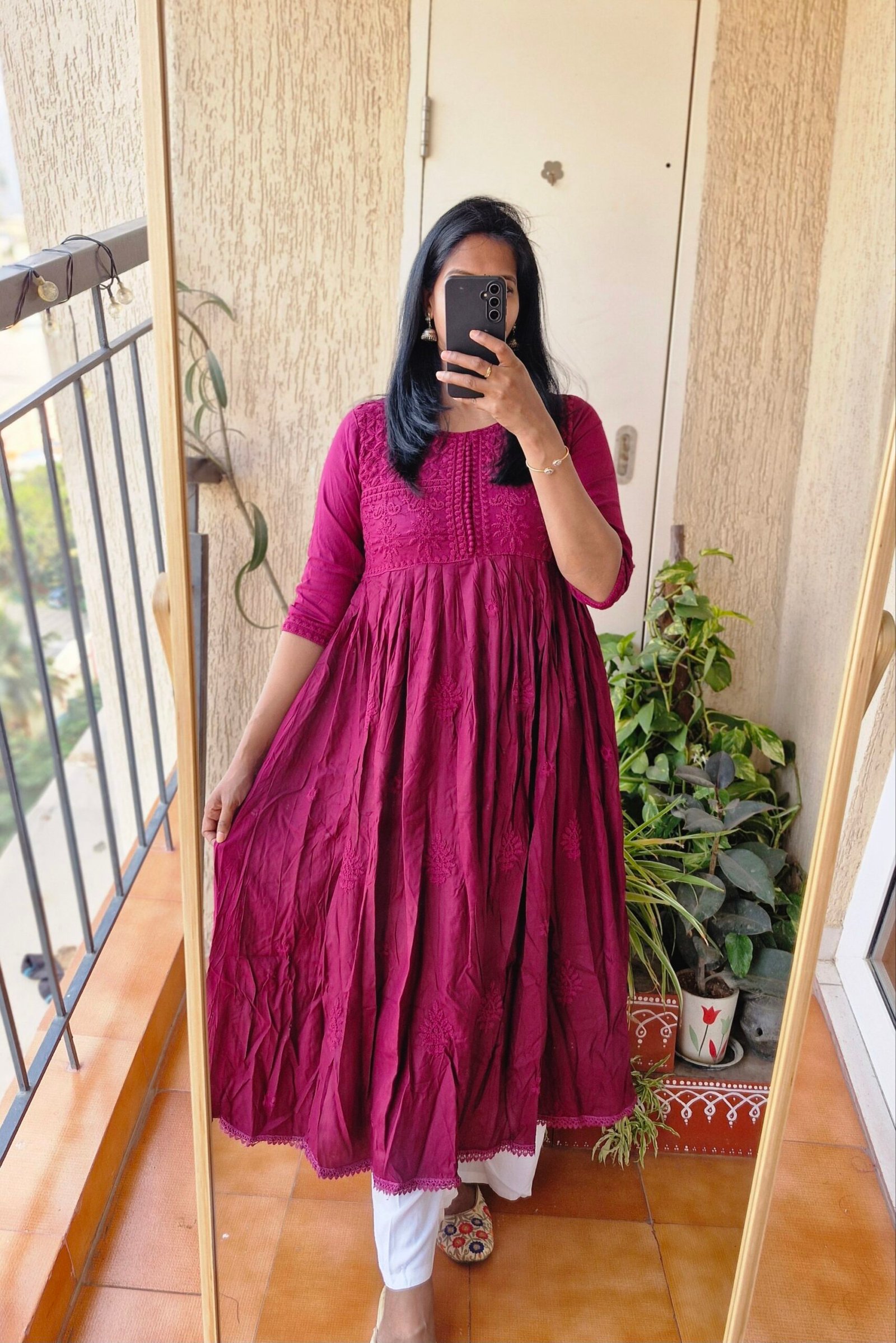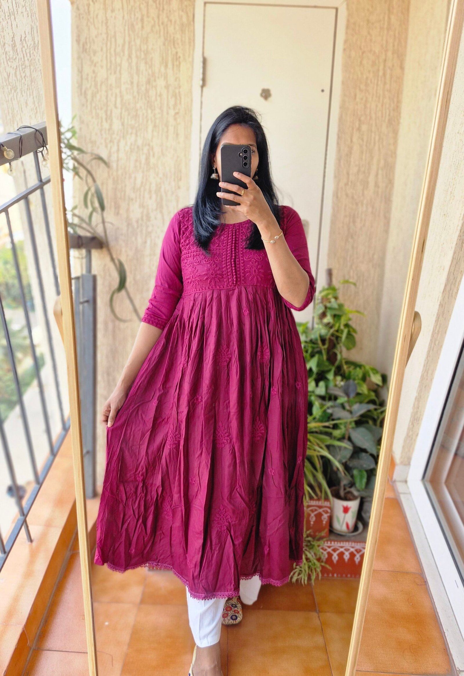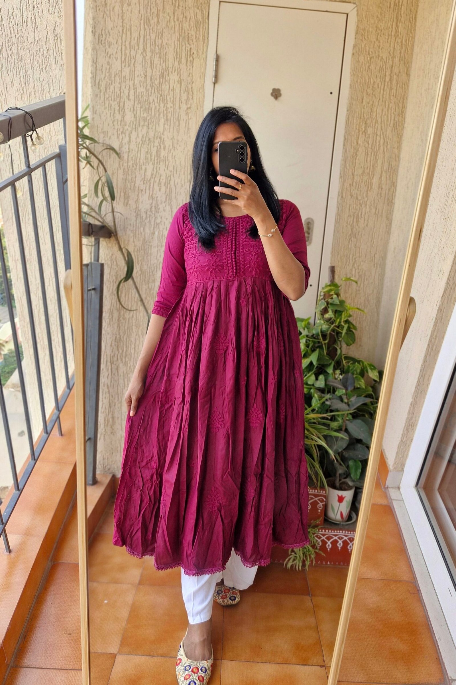 Wine Solid Rayon chikankari dress.